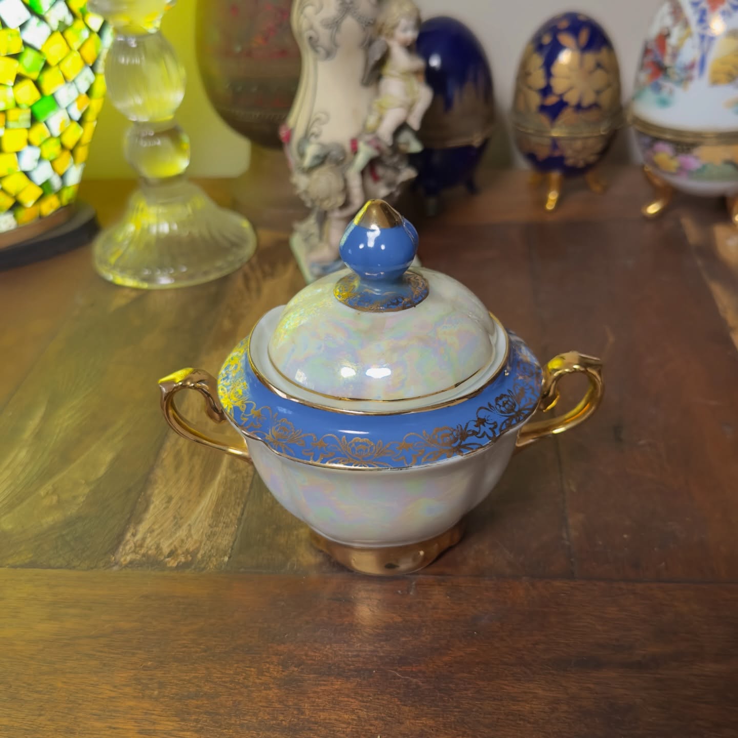 Açucareiro em Porcelana Real, furta-cor com detalhes em azul e dourado. Peça da década de 60, com acabamento elegante e brilho característico.