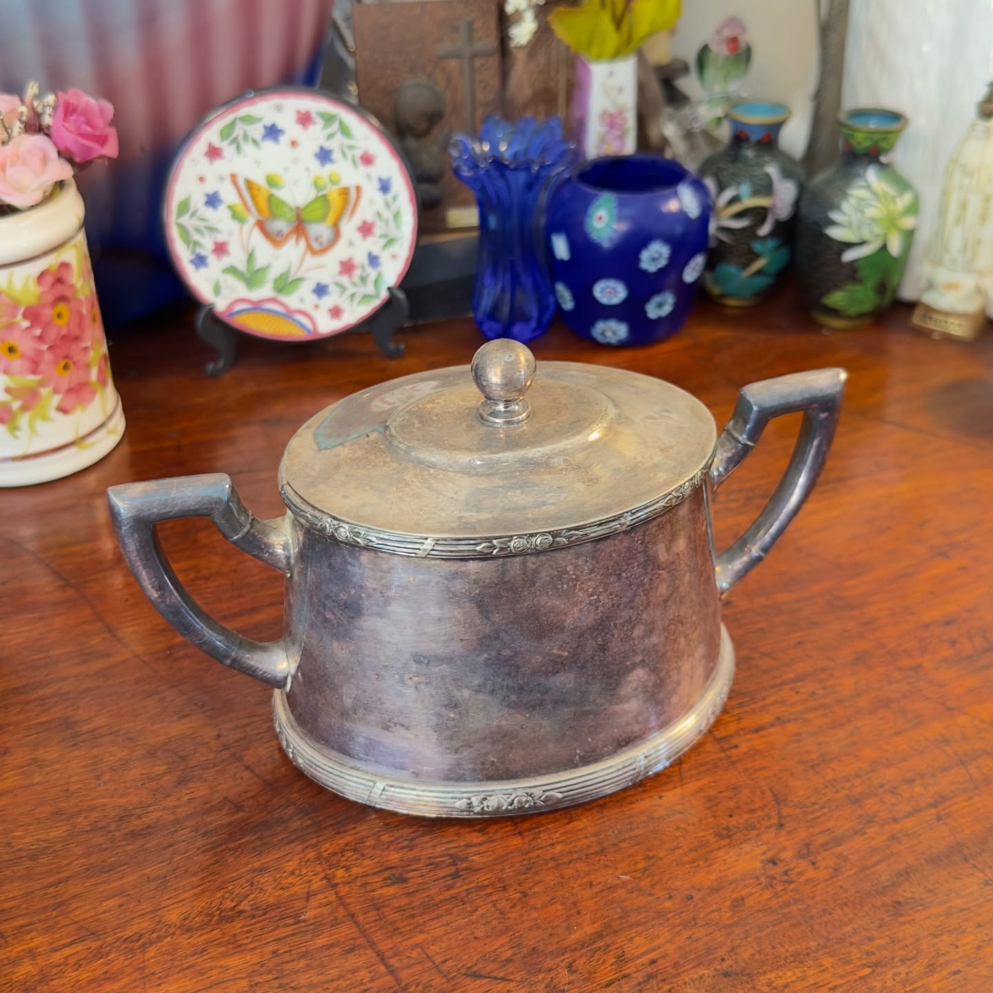 Açucareiro em metal com espessa camada de prata, fabricado pela renomada marca Wolff, combinando funcionalidade e tradição. Apresenta design clássico de formato ovalado com tampa removível e pomel em formato de esfera. A peça apresenta pátina do tempo e marcas de uso que preservam sua originalidade e caráter vintage.
