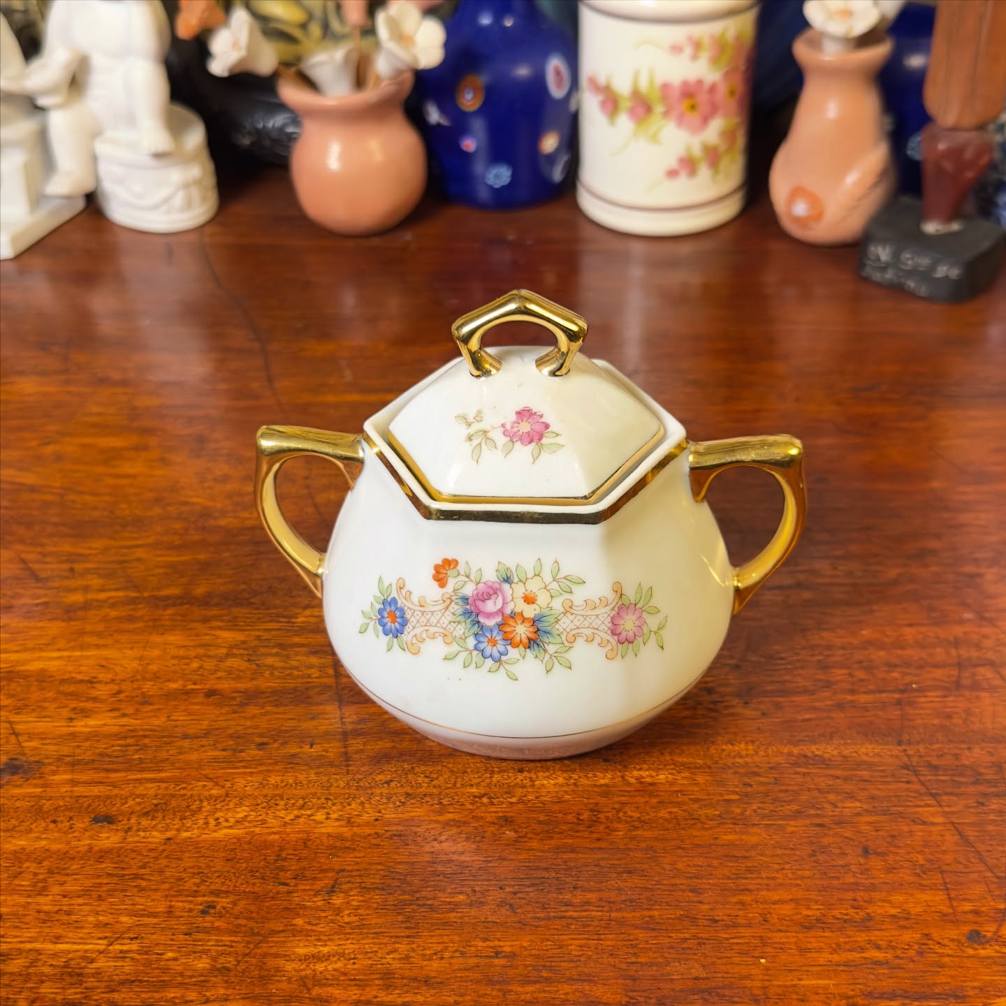 Açucareiro de porcelana Monte Alegre datado entre 1950 e 1970. Complemento de serviço com decoração floral delicada e filetes em ouro. Uma peça clássica e charmosa, ideal para adicionar elegância vintage à sua mesa de café ou chá.
