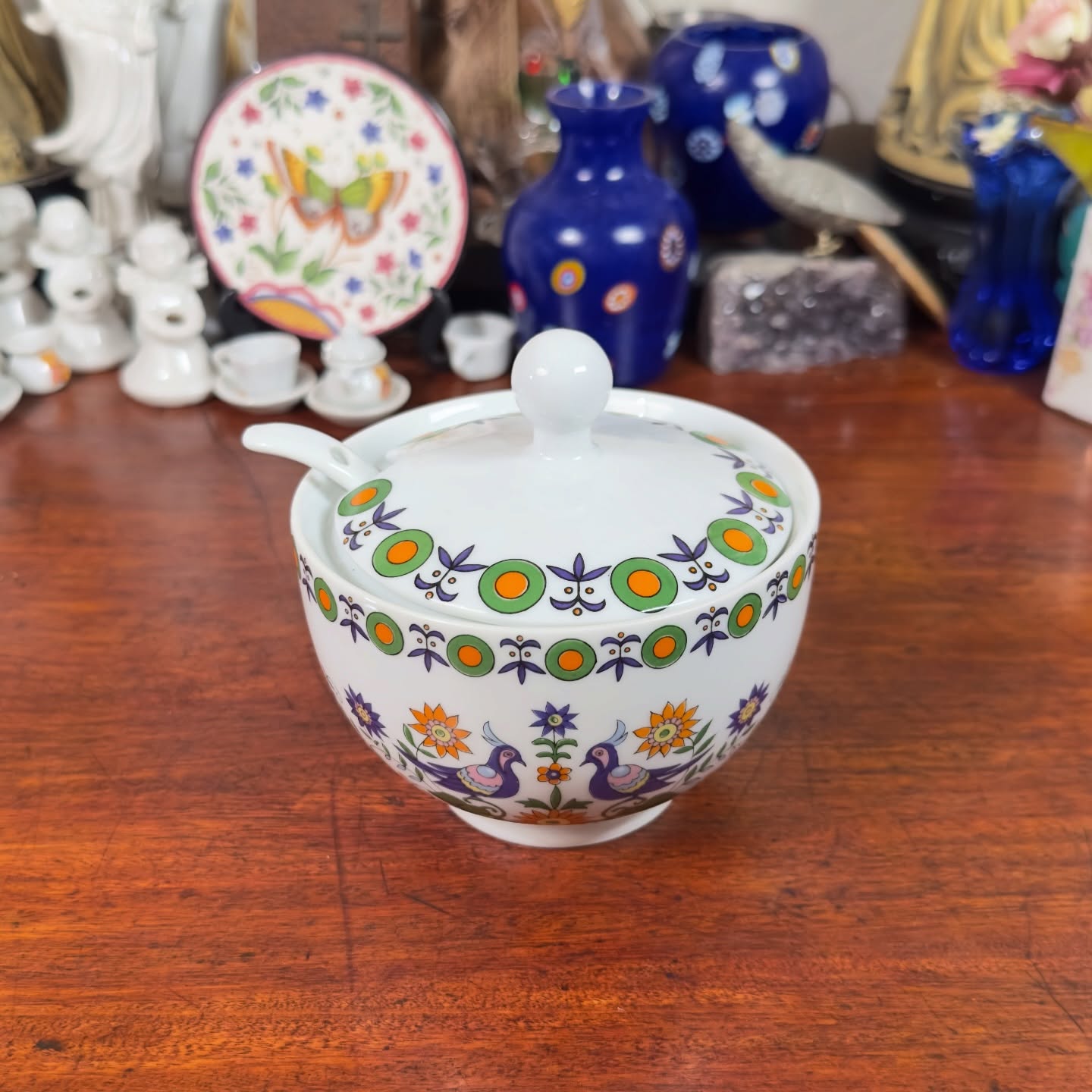 Exibe rica decoração policromada com pássaros e elementos florais, além de padronagem geométrica na borda. Apresenta conservação impecável, mantendo o brilho original da vitrificação. Design funcional e decorativo, com cores vibrantes que trazem a estética marcante da época.