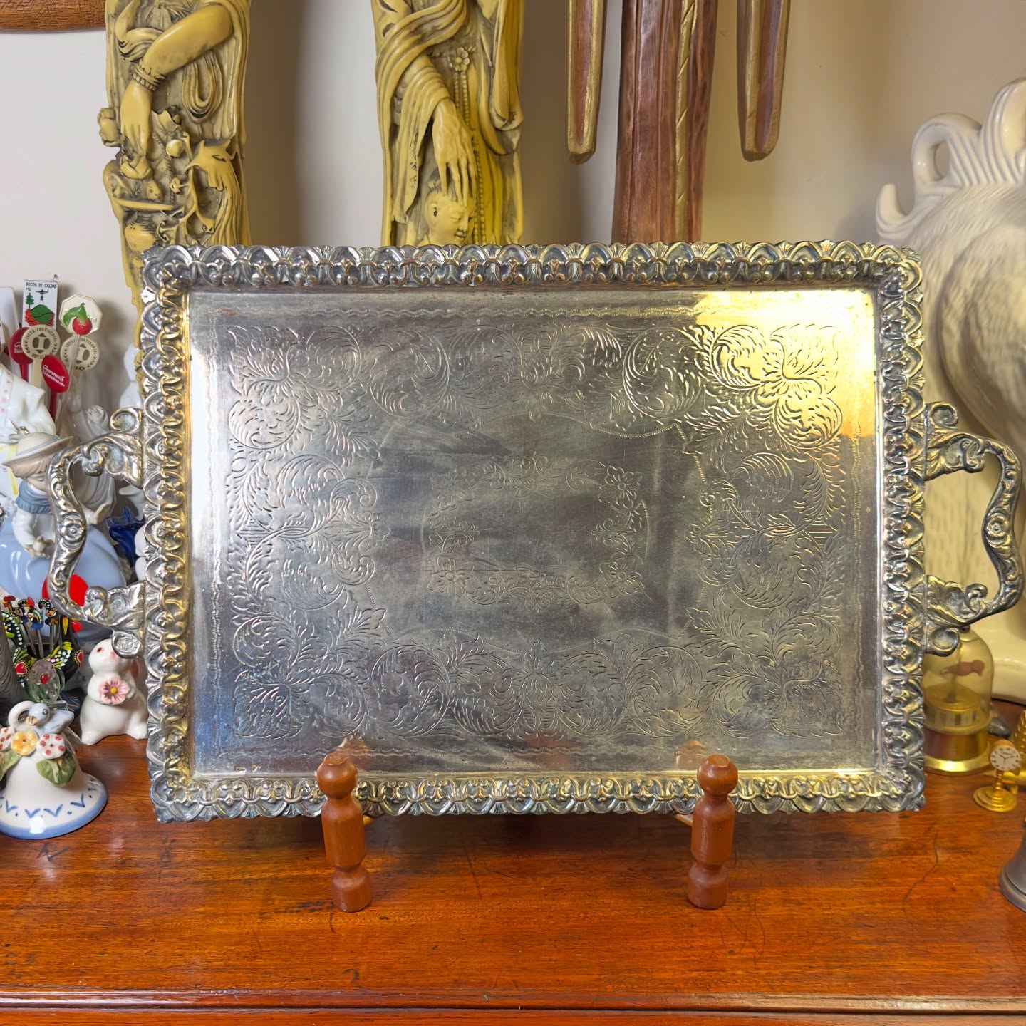 Antiga bandeja retangular banhada a prata, ricamente trabalhada com delicados relevos e desenhos florais em toda a superfície. Conta com alças laterais robustas e borda ornamentada em relevo, destacando o requinte de sua época. Apresenta sinais de uso e pátina natural, que reforçam sua autenticidade e beleza histórica, sendo uma peça de grande charme para colecionadores e amantes de antiguidades.