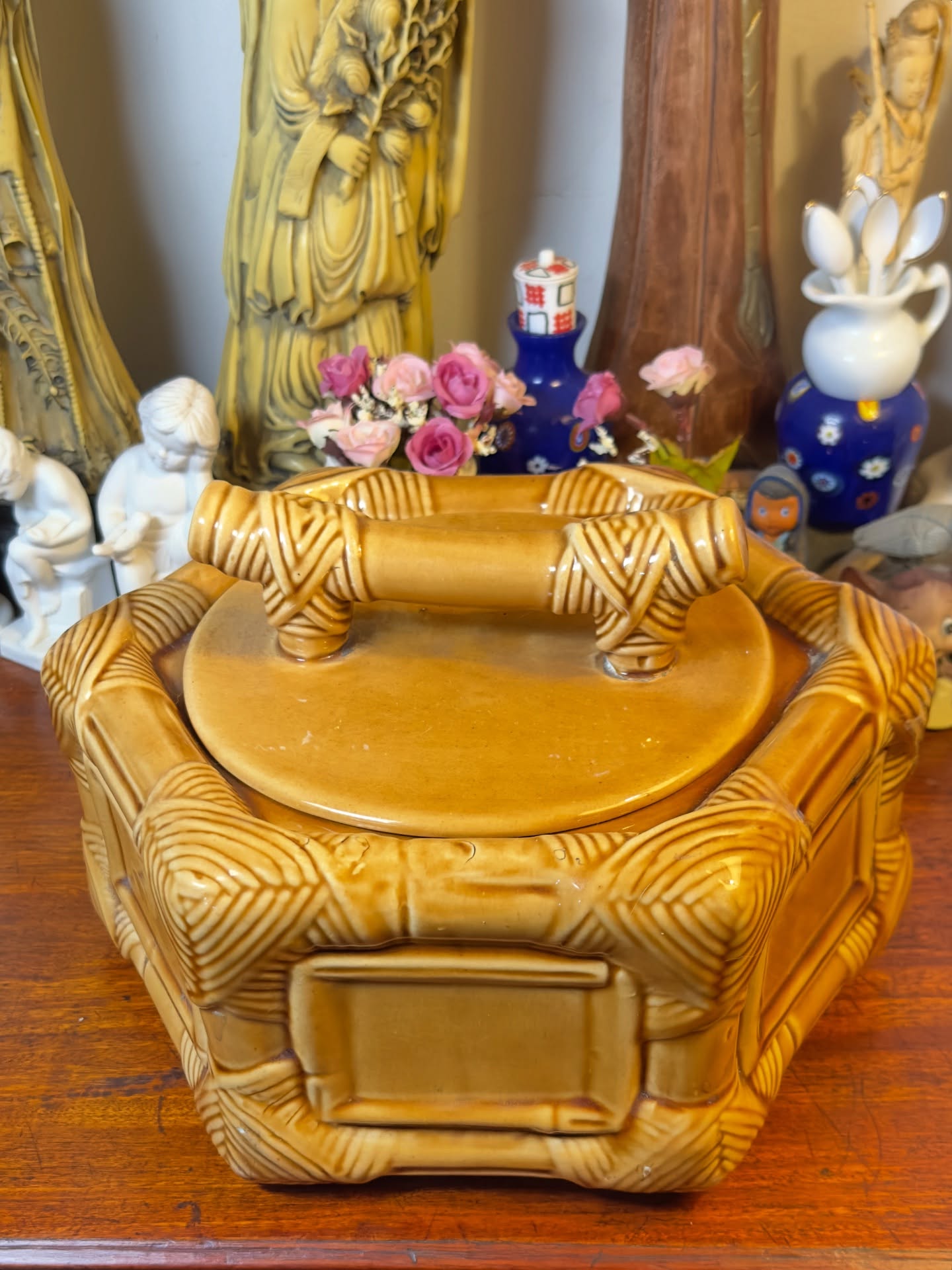 Antiga caixa em cerâmica esmaltada, trabalhada com refinado aspecto de bambu.