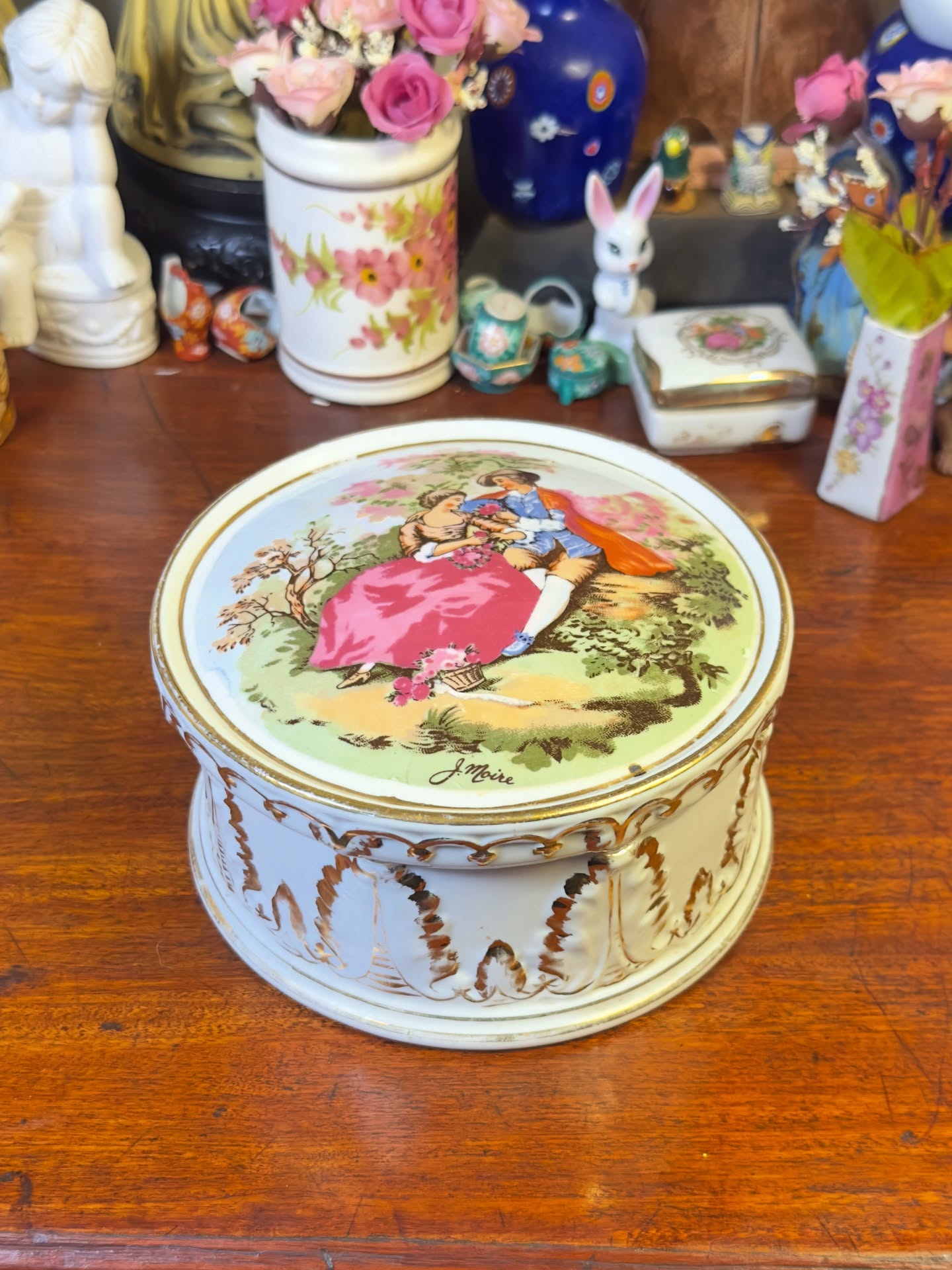 Antiga caixa em porcelana Vera Cruz, delicadamente decorada com cena galante e elegantes filetes dourados, um charme clássico da tradição brasileira.