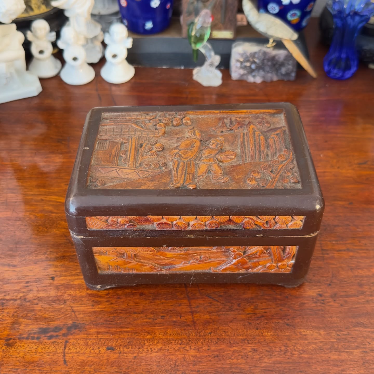 Antiga caixa porta-joias em madeira esculpida à mão oriental. Apresenta ricos detalhes em alto-relevo na tampa e nas laterais, ilustrando cenas orientais.
