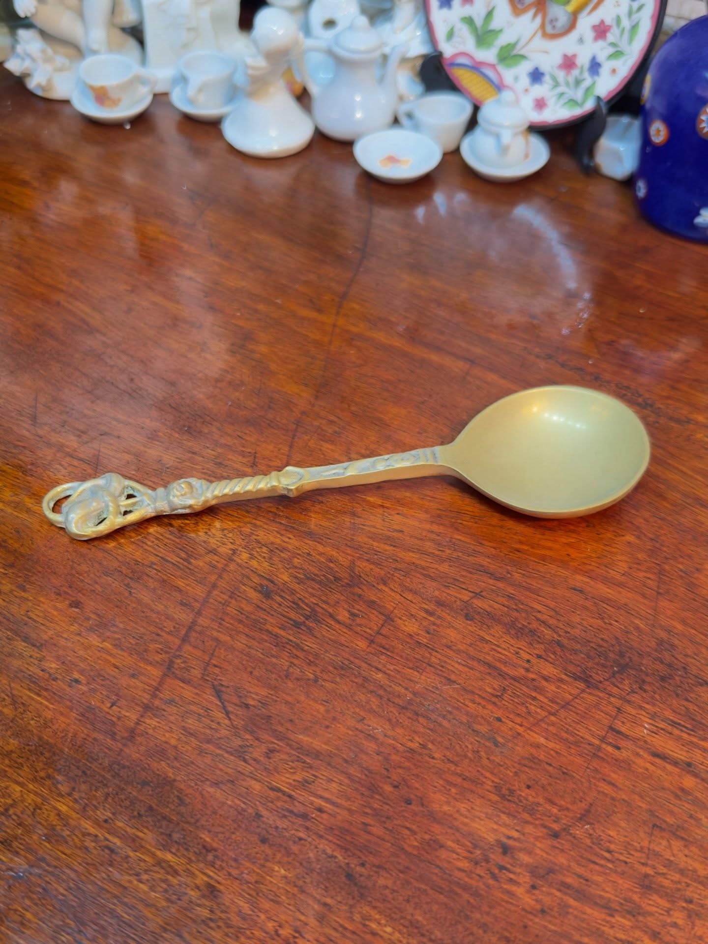 Peça robusta com cabo ricamente trabalhado em relevo e detalhes vazados. Apresenta haste torcida e acabamento em tom dourado. Utensílio funcional para servir café, chá ou especiarias, trazendo presença e sofisticação à mesa.