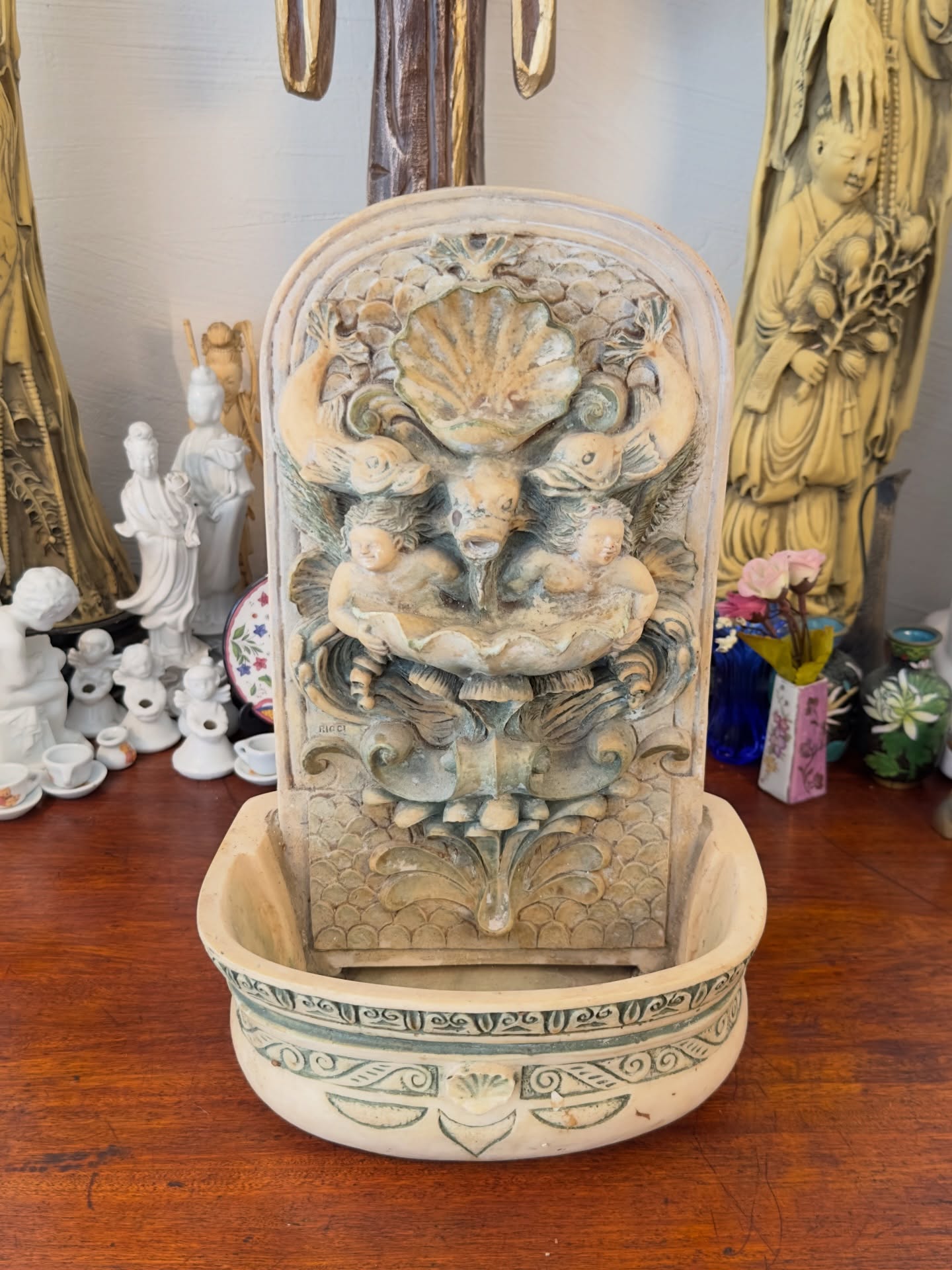 Antiga fonte ornamental com querubins, golfinhos e conchas em relevo. Peça com pátina em tons de bege e verde.