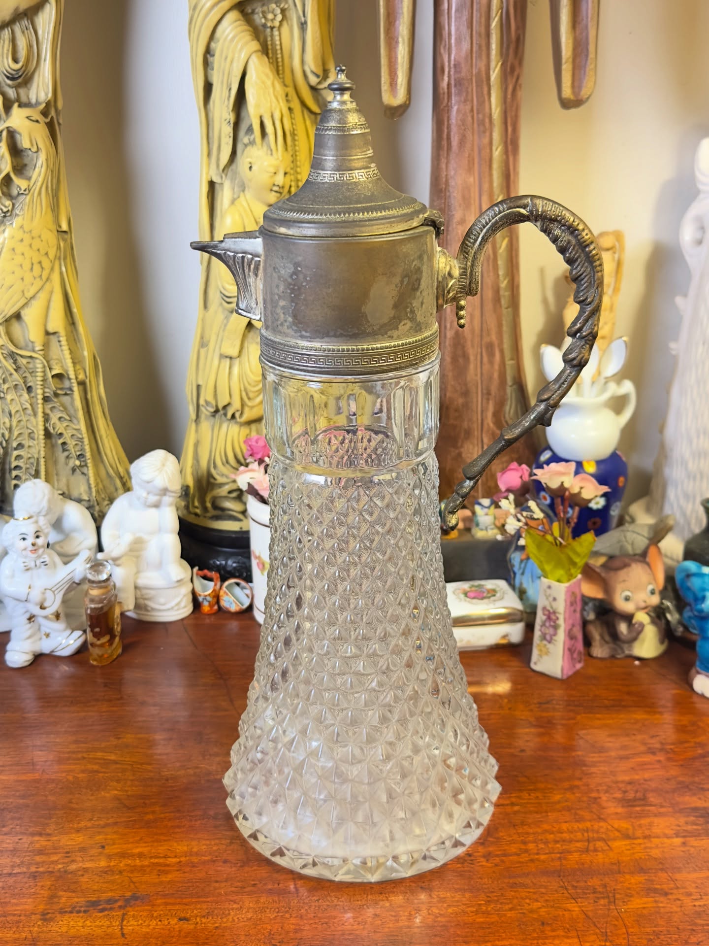 Antiga jarra italiana em clássico vidro bico de jaca, com bico e alça em metal ricamente trabalhado.