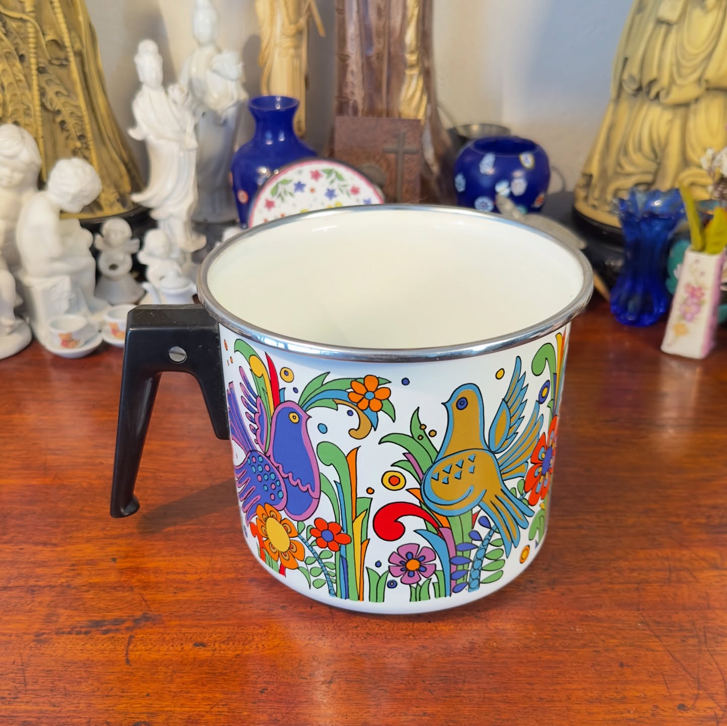 Peça alemã da renomada marca Asta, produzida em metal esmaltado. Apresenta o padrão floral com aves em cores vibrantes, mantendo o brilho original de esmaltação.