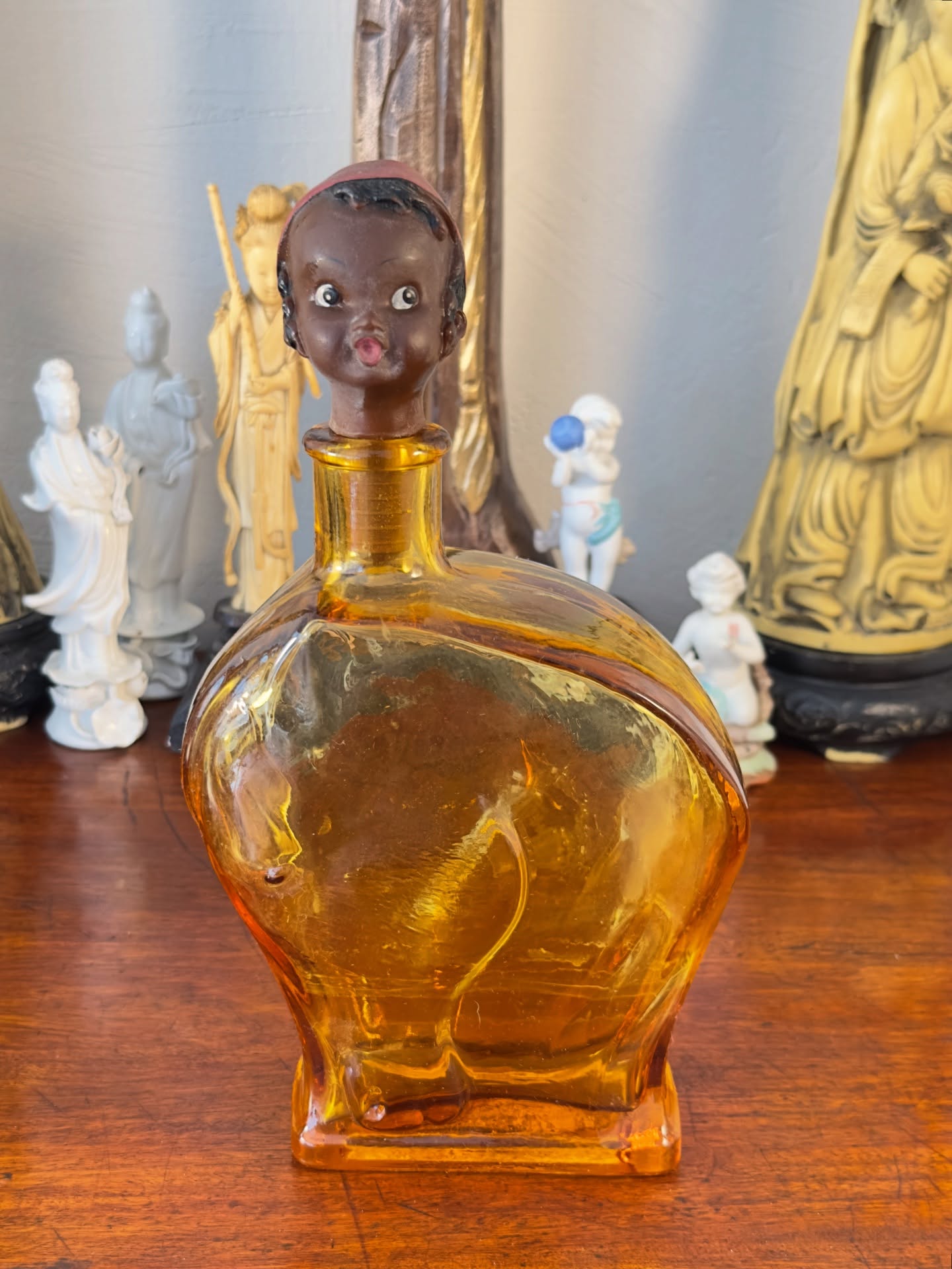 Garrafa antiga com rolha figurativa no formato de cabeça. Peça de coleção, estilo barware, da metade do século XX. O vidro âmbar possui belo design representando o formato da cabeça de um cavalo.