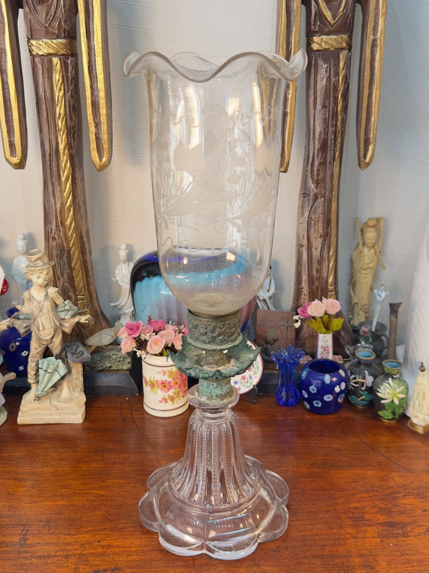 Peça de mesa com base em cristal moldado e lapidado, apresentando pé circular e fuste canelado. Estrutura central em bronze com ornamentos fitomórficos. A manga em cristal transparente possui borda ondulada e corpo decorado com lapidação manual de guirlandas e folhagens. Exemplar característico da iluminação de grandes propriedades rurais do final do século XIX e início do XX, unindo funcionalidade e requinte