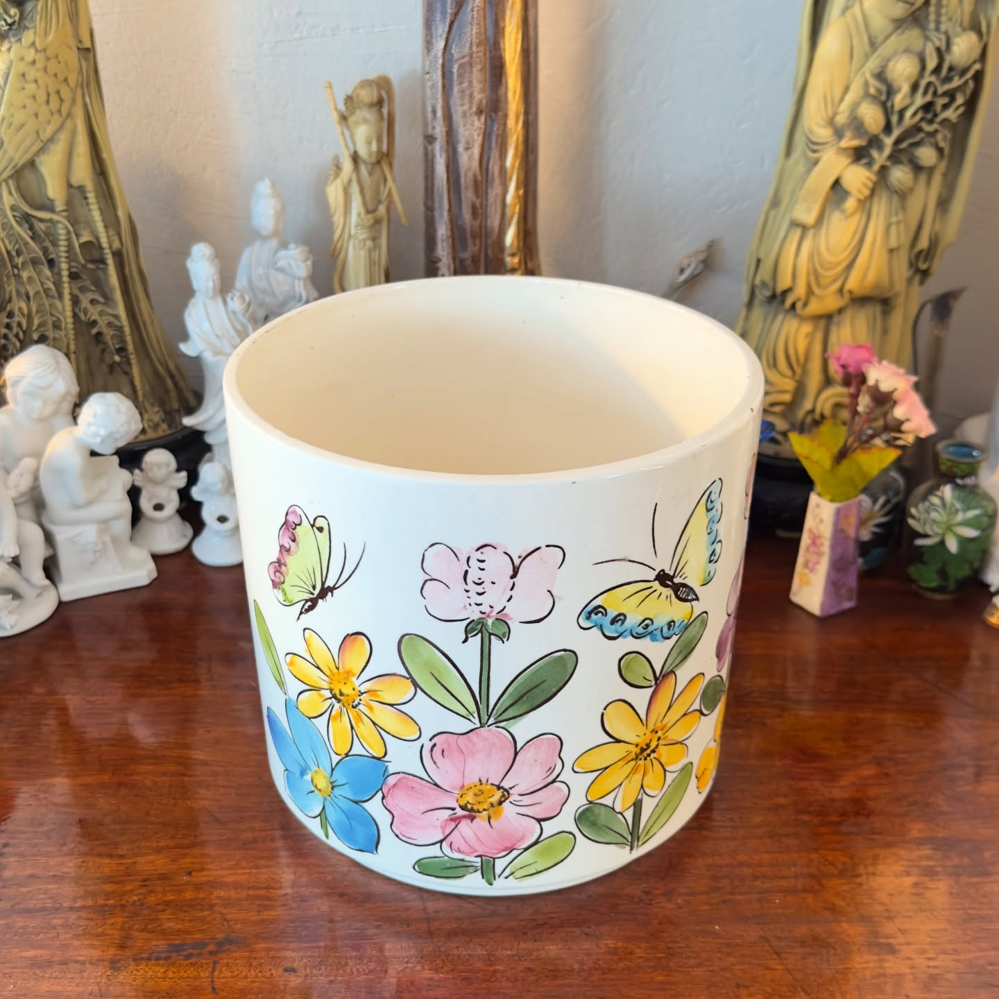 Antigo Cachepot em Cerâmica, pintado à mão, com estampa floral e borboletas. Peça fabricada no Brasil, década de 80. Apresenta sutis marcas de uso e desgastes na base, conforme visível nas fotos. Possui furo para drenagem com vedação.