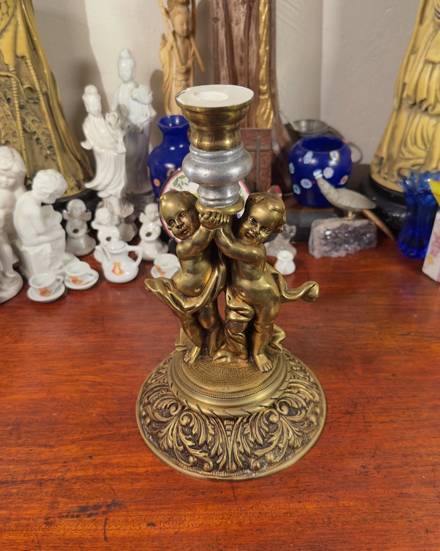 Antigo castiçal em bronze maciço com trabalho artístico clássico. A coluna central é composta por dois querubins esculpidos que sustentam o bocal. Base circular apresenta ornamentos em relevo de folhagens e volutas.