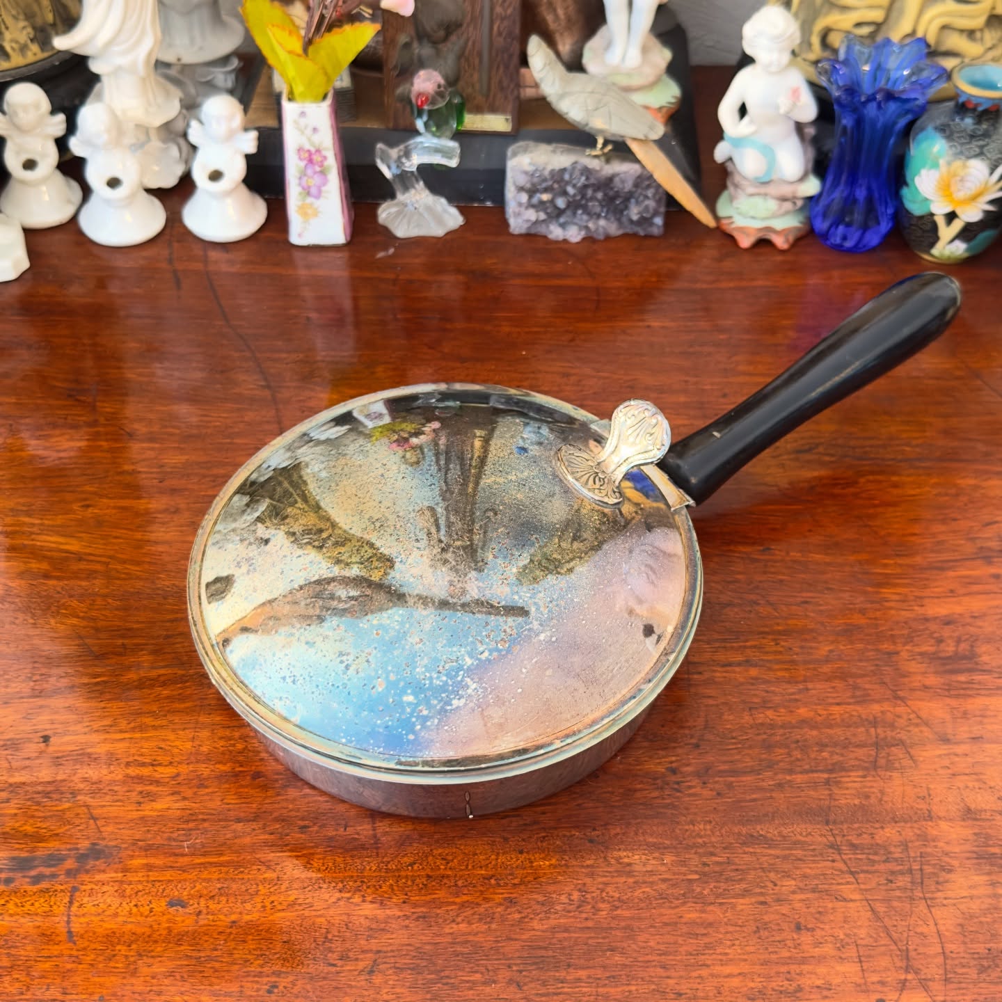 Antigo cata cinzas, migalhas em Prata 90 Belprata. Peça com cabo em baquelite preta e tampa articulada, apresentando pátina natural do tempo. Design clássico e funcional.