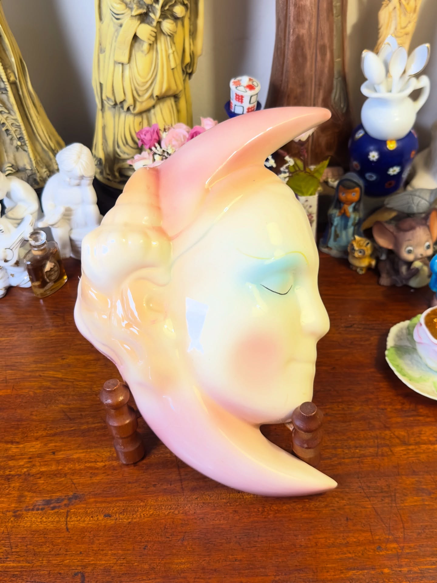 Antigo enfeite “Lua com rosto feminino” em porcelana anos 70, delicado tom rosa com suave efeito cintilante.