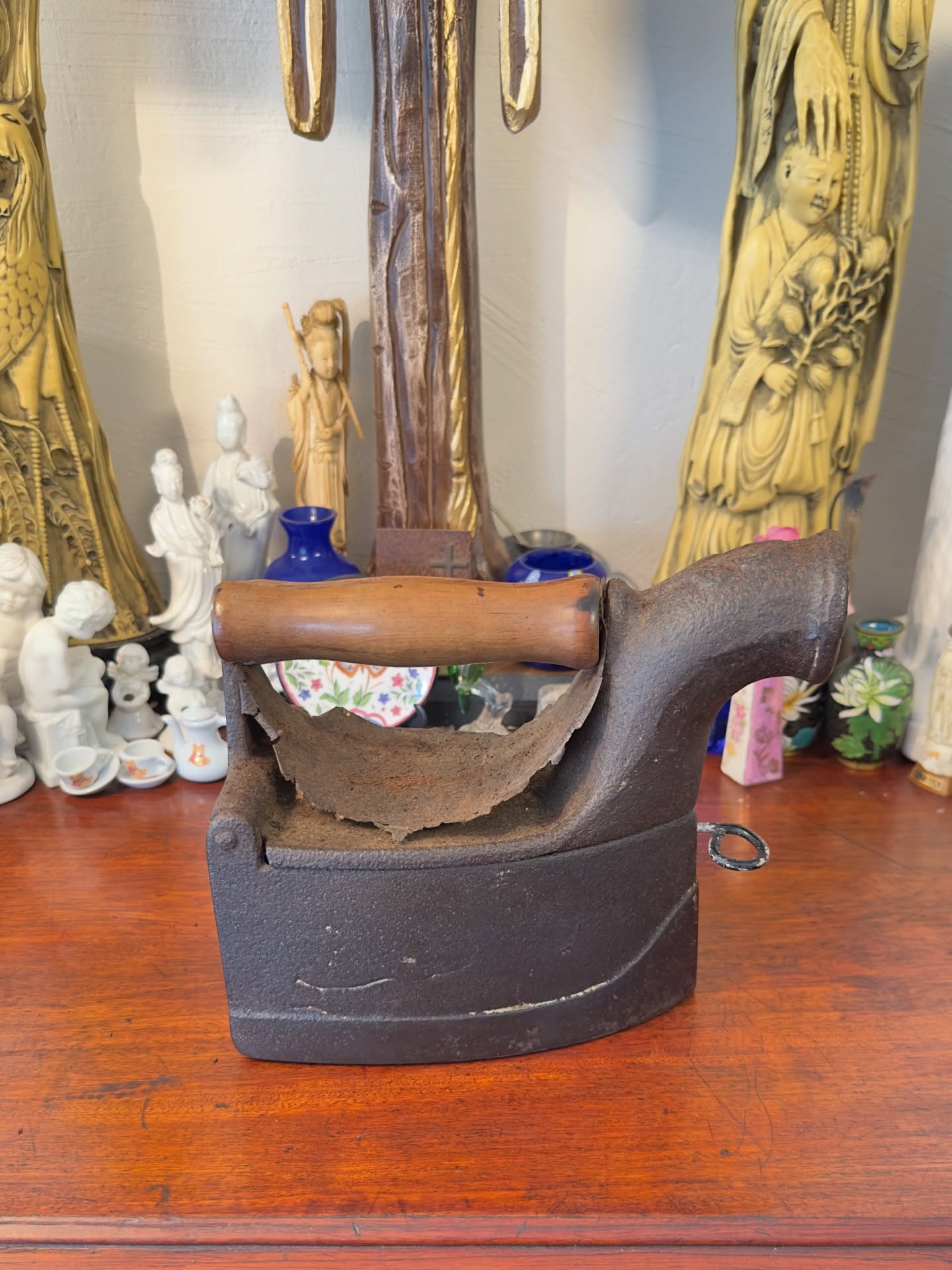 Antigo ferro a carvão em ferro. Apresenta corpo robusto e puxador em madeira com marcas de uso e desgaste natural no cabo, peça histórica.
