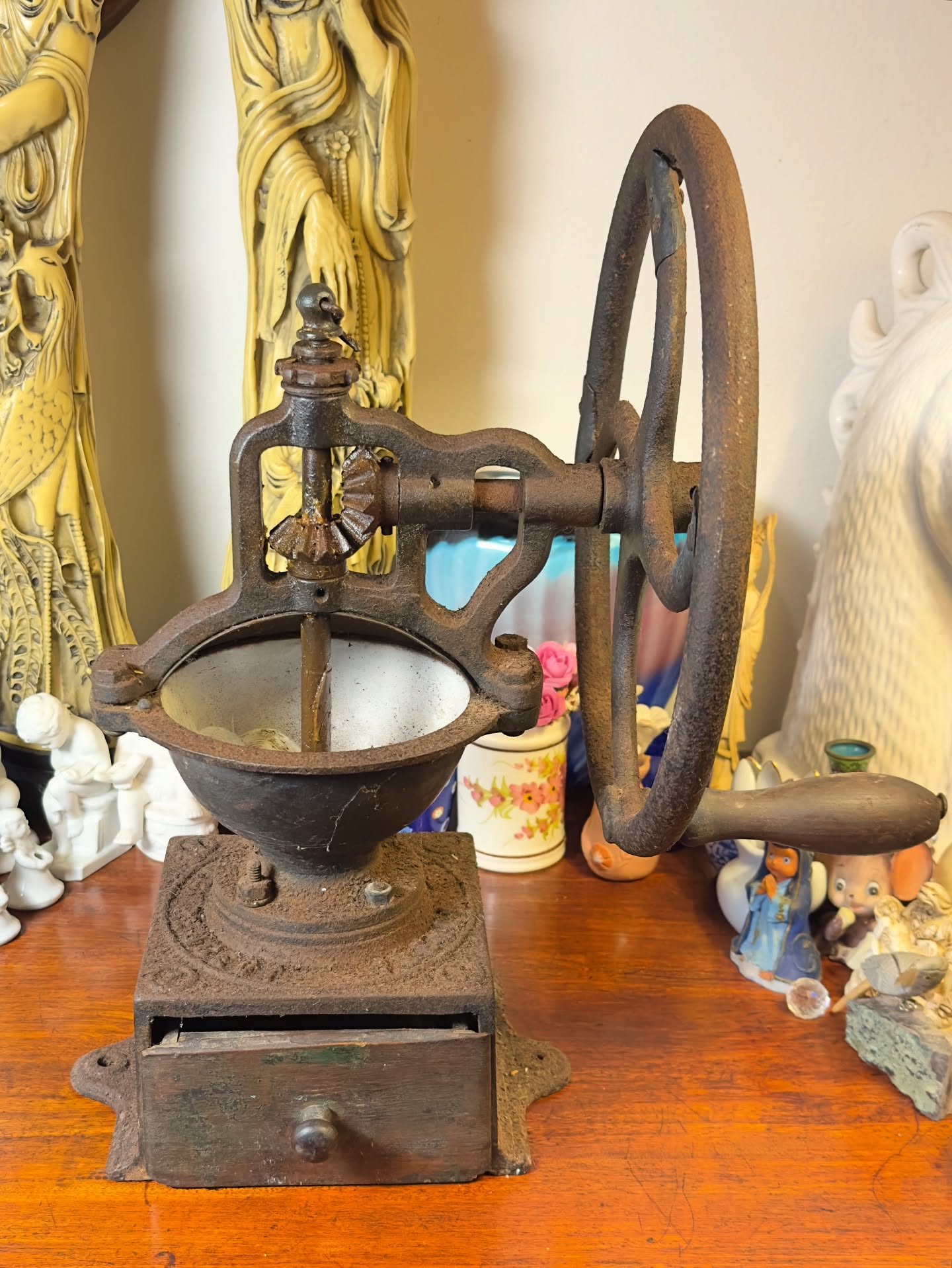 Antigo moedor de café centenário Peugeot, peça de grande encanto histórico, com belo acabamento em madeira e ferro fundido, preservando um autêntico estado rústico.