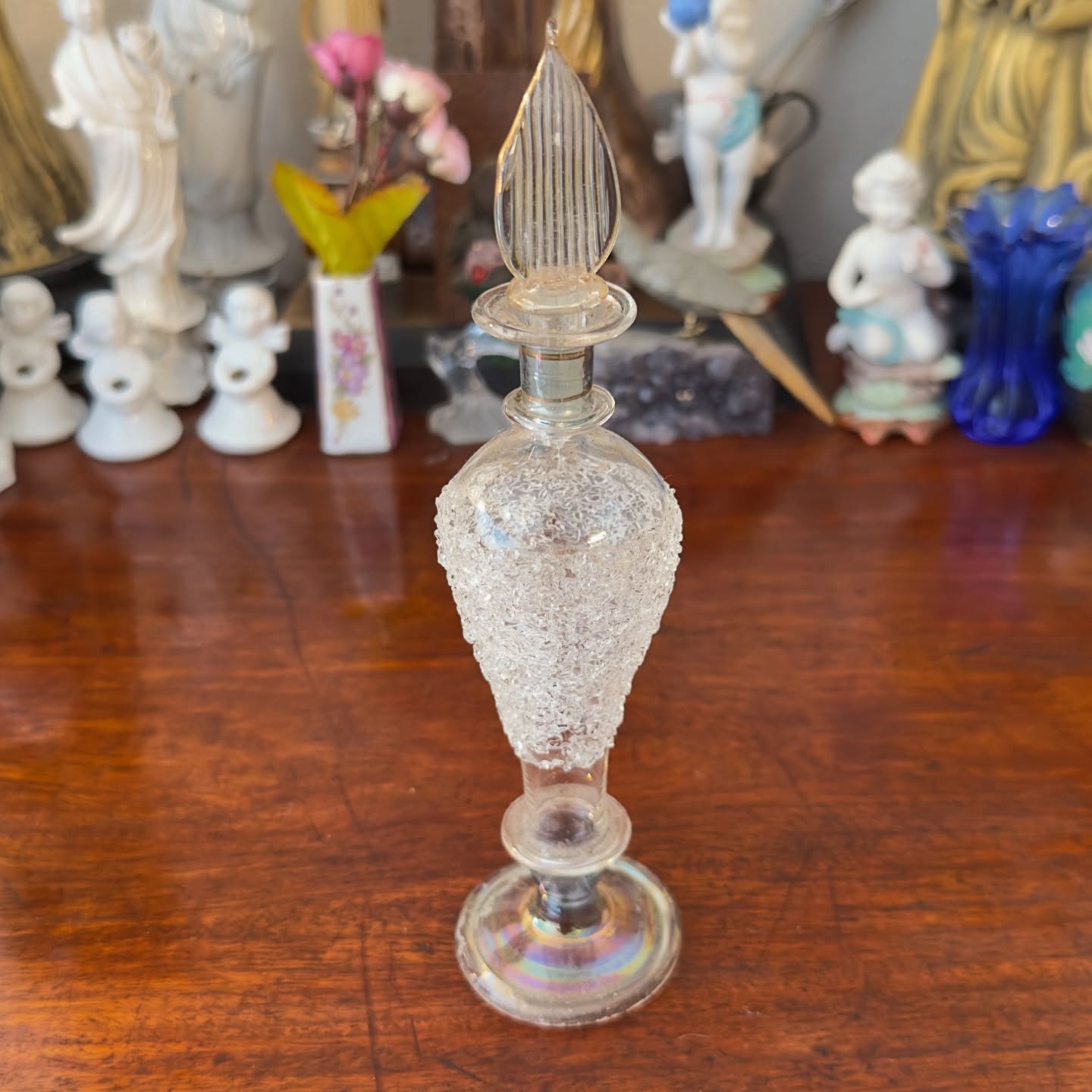 Antigo Perfumeiro em Vidro, com corpo decorado em textura tipo “salpicado” ou “gelo”. Tampa original lapidada em formato de chama. Base circular com reflexo furta-cor.