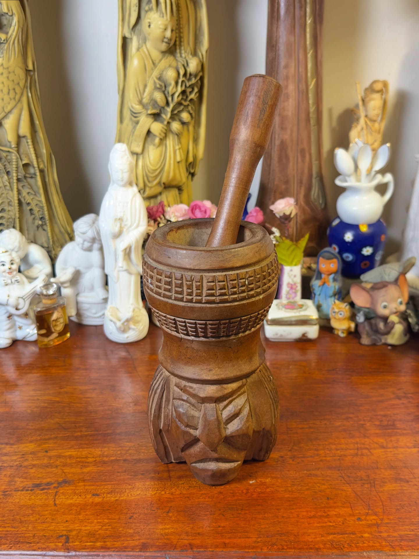 Antigo pilão esculpido em madeira nobre, com expressivo rosto de índio finamente trabalhado.