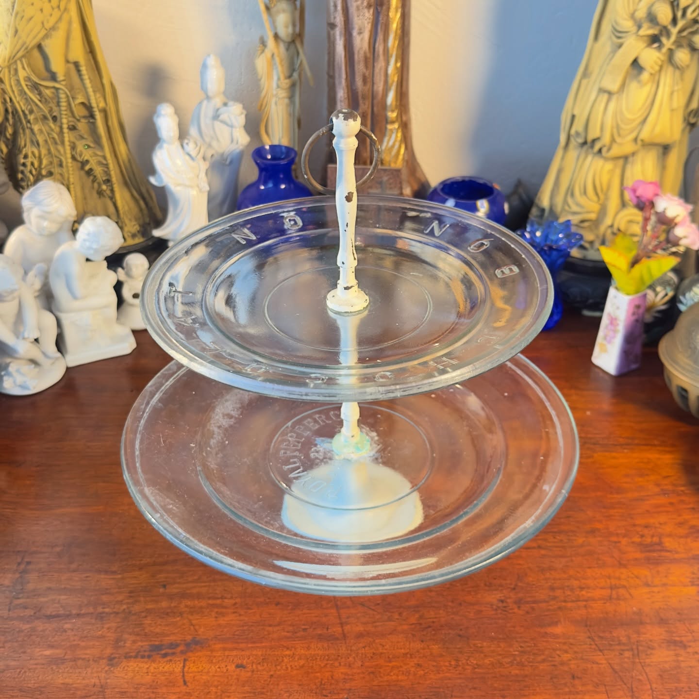 Antigo Prato de Doces Dois Andares Royal Pepper Co. Peça em vidro moldado com inscrições em relevo “Bonbon” e “Chocolat”. Possui haste central metálica original com pintura branca e marcas do tempo que conferem pátina autêntica. Ideal para servir ou decoração.