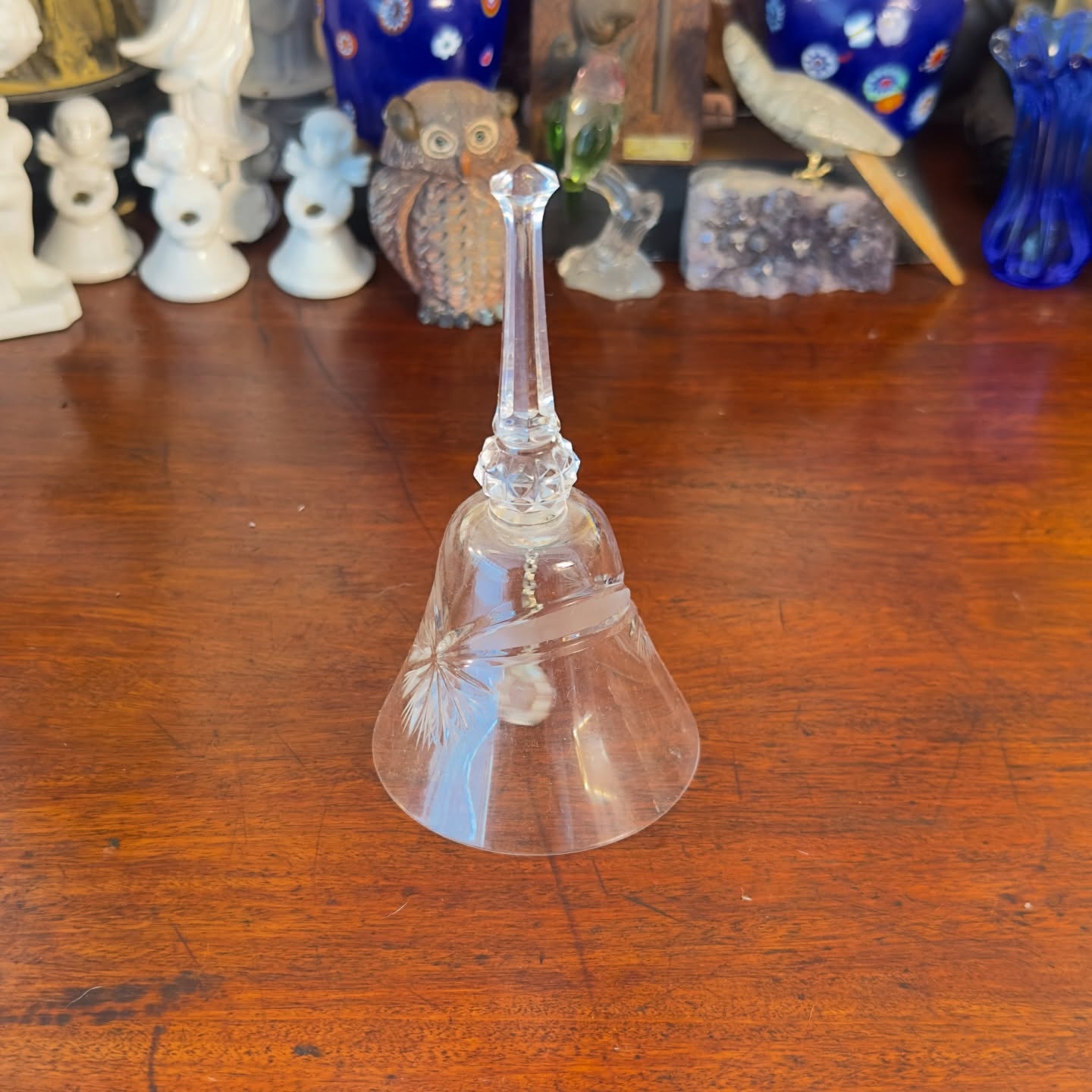 Antigo Sino em Vidro, década de 80. Possui lapidação clássica em estrela e cabo facetado. O badalo original é composto por corrente metálica e esfera de vidro, garantindo o som característico da peça. Sem trincas ou bicados.
