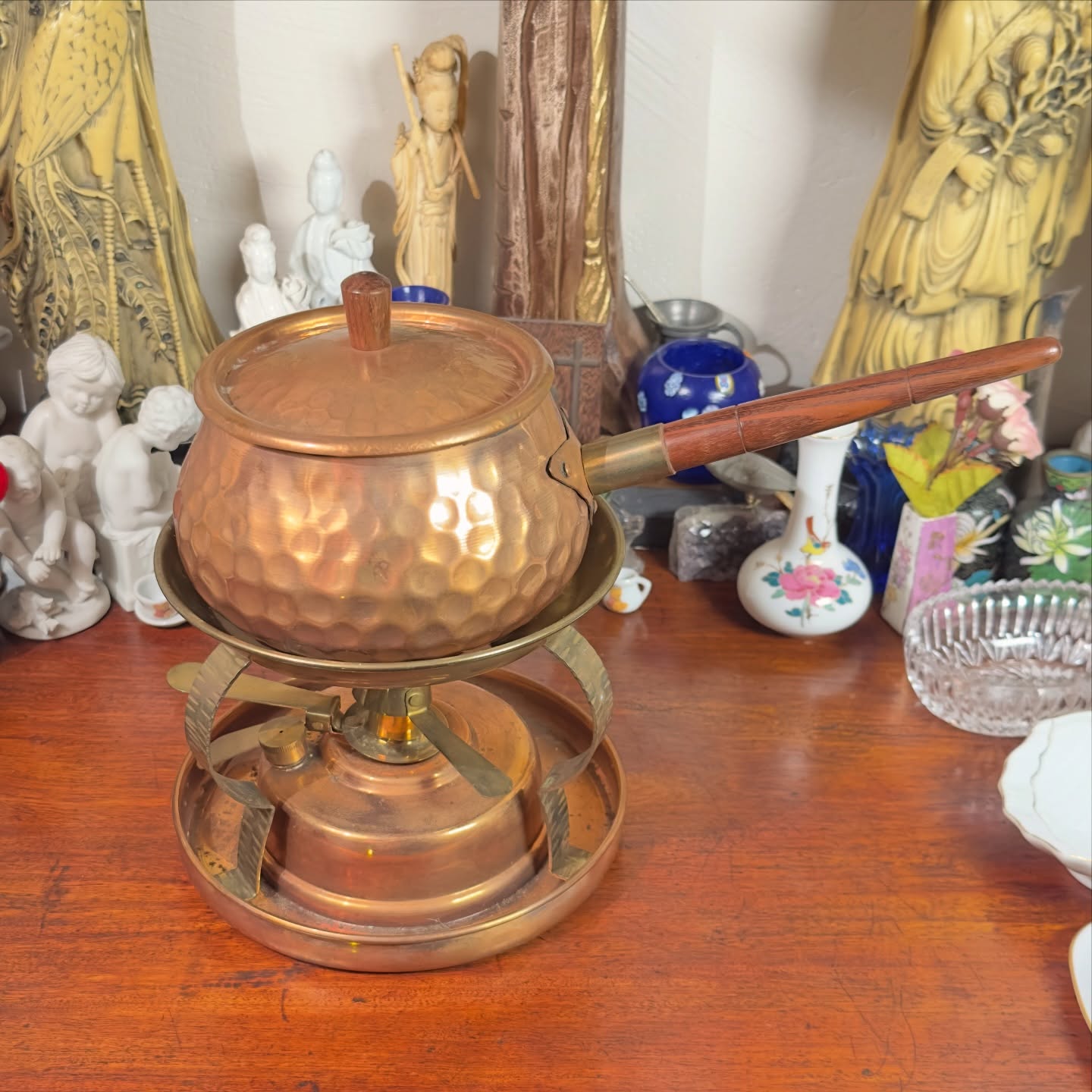 Conjunto completo para fondue fabricado em cobre com acabamento martelado e interior estanhado. Acompanha rechaud estruturado, queimador e tampa com pegador em madeira, garantindo segurança e elegância ao servir. Cabo longo em madeira facilita o manuseio e evita o aquecimento. Item funcional e decorativo, com excelente retenção térmica para manter queijos ou chocolates na temperatura certa.