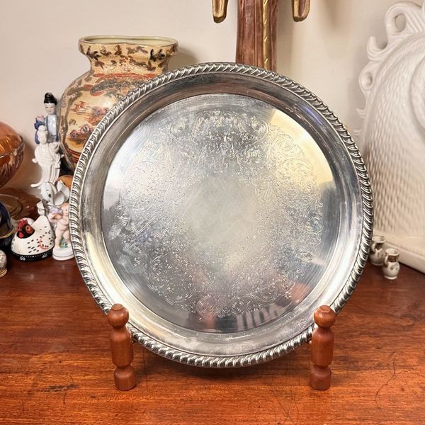 Elegante bandeja redonda em metal Silver, com um belo acabamento vintage e leves marcas de uso que conferem autenticidade e charme à peça. Perfeita para adicionar um toque clássico e sofisticado à decoração.