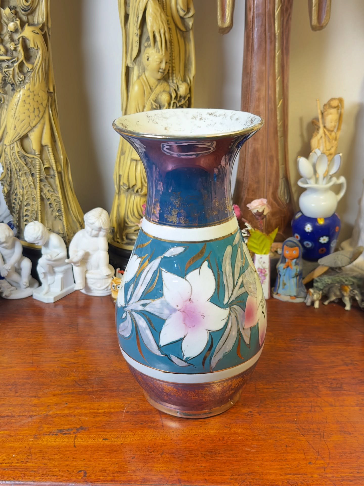 Belíssimo e antigo jarro em porcelana, com delicado efeito furta-cor e tons vibrantes que realçam sua elegância e presença.