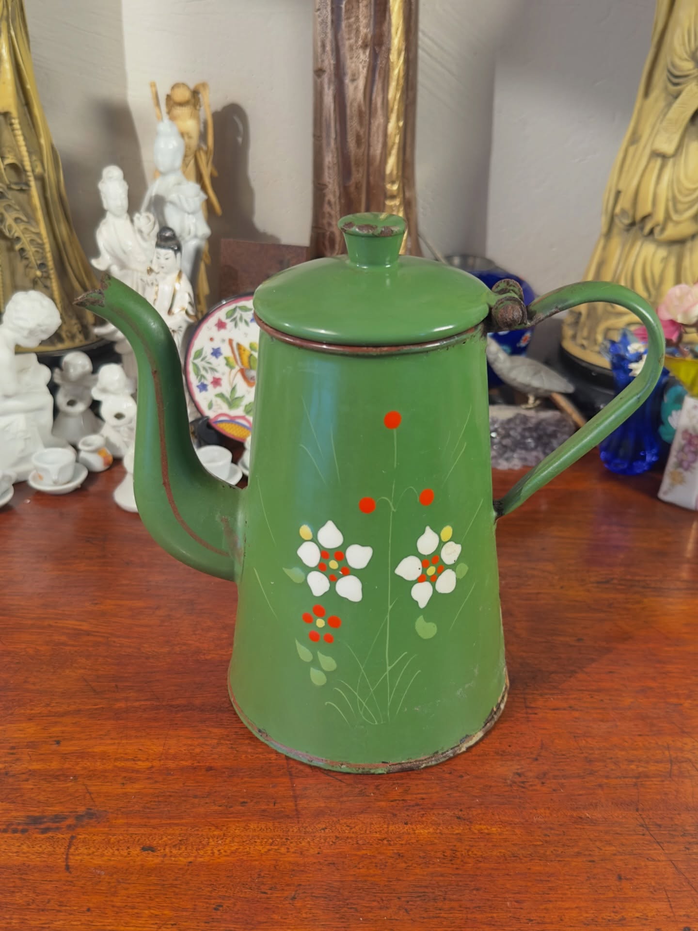Apresentando corpo cônico e tampa articulada. A peça exibe delicada pintura floral feita à mão, com pétalas brancas e centros em tons de laranja e amarelo que decoram as laterais.