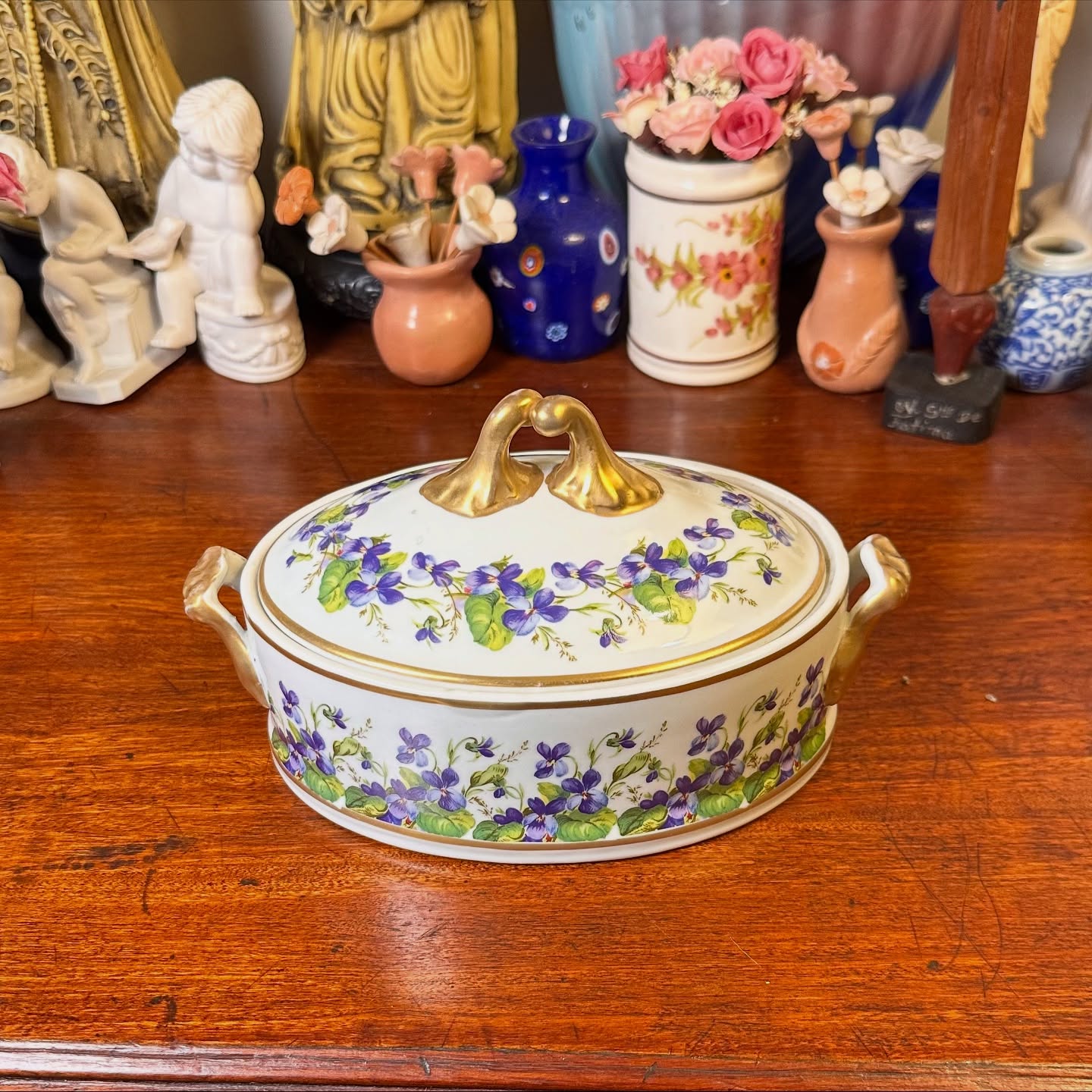 Elegância e história em uma única peça. Esta linda caixa oval com tampa apresenta pintura manual de violetas vibrantes e acabamento em filetes dourados. Ideal para guardar joias ou servir doces.