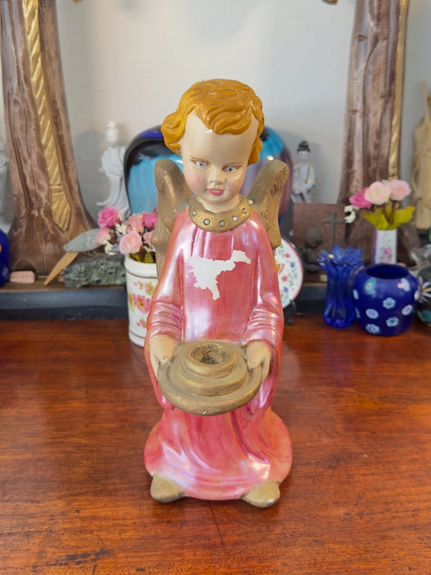 Escultura religiosa em estuque policromado com 27 cm de altura. Representa anjo em prece com acabamento em tons de rosa e dourado. Possui bocal para vela e detalhes ornamentais com aplicações peroladas no colar. Design inspirado no barroco, com asas detalhadas e túnica fluida.