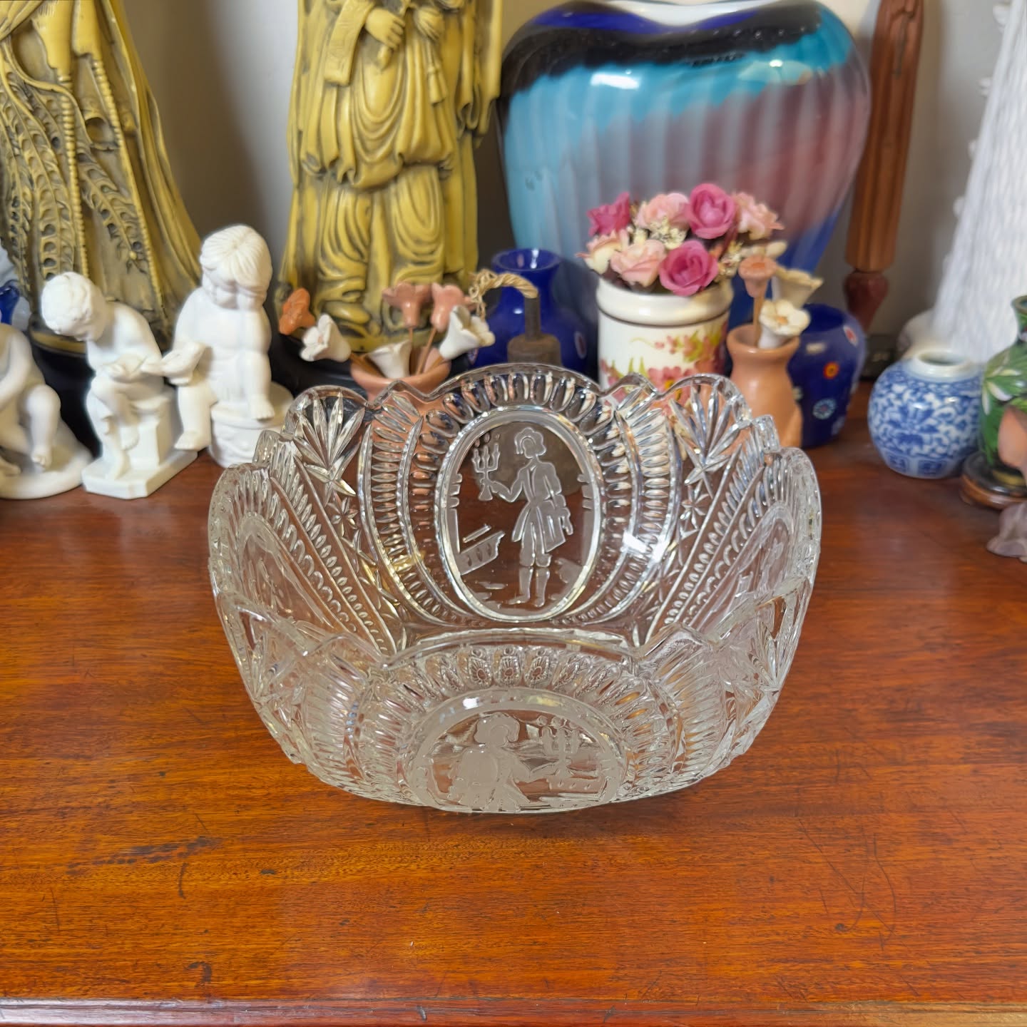 Design imponente, com gravuras em relevo de figuras clássicas. Lapidação profunda em estrela, destacando brilho e requinte. Uma peça europeia, perfeita para decoração sofisticada.