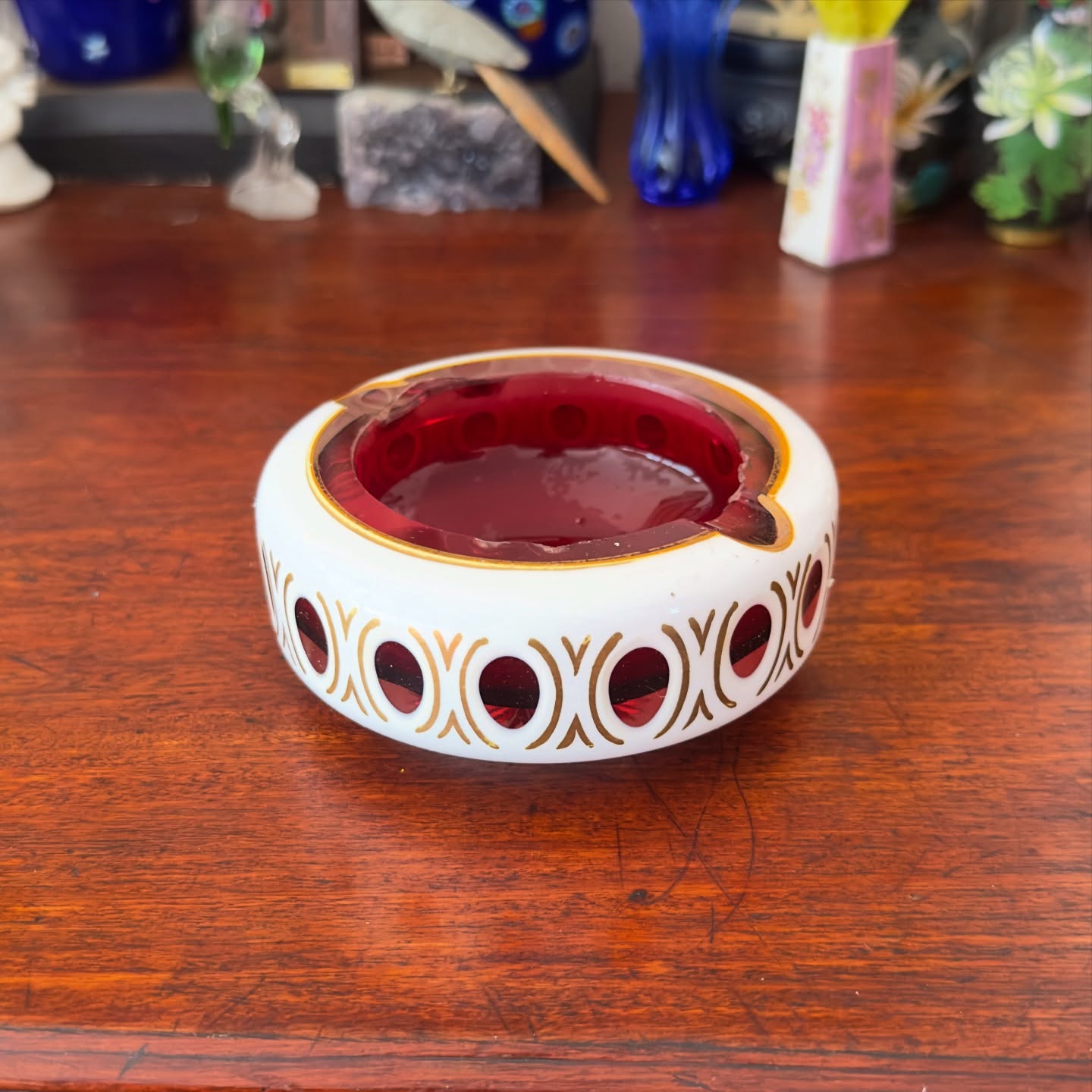 Cinzeiro antigo em cristal overlay rubi, Apresenta lapidação externa em medalhões e base com estrela radiante. Detalhes em ouro na borda e no corpo. Possui pequenos bicados na borda interna superior, conforme mostram as fotos.