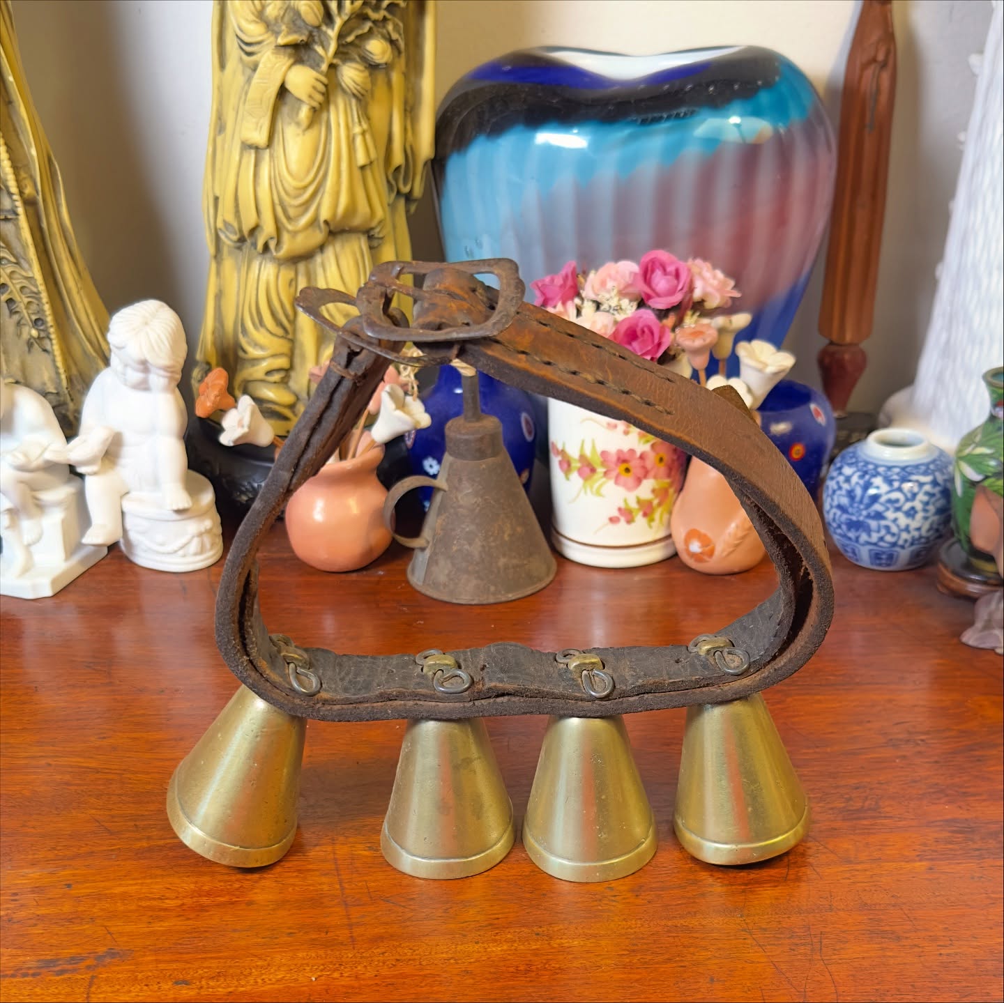 Peça rara com quatro sinos, montados em tira de couro, um dos sinos está sem badalo, conforme fotografado.