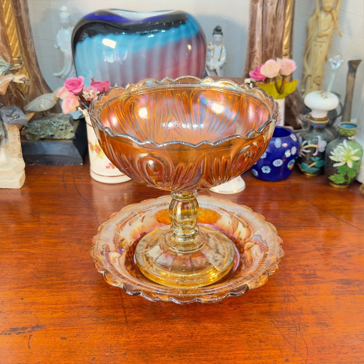 Conjunto composto por compoteira e prato de apoio em vidro prensado com acabamento furta-cor. As peças apresentam tonalidade âmbar profunda com reflexos metálicos característicos do vidro Carnival.