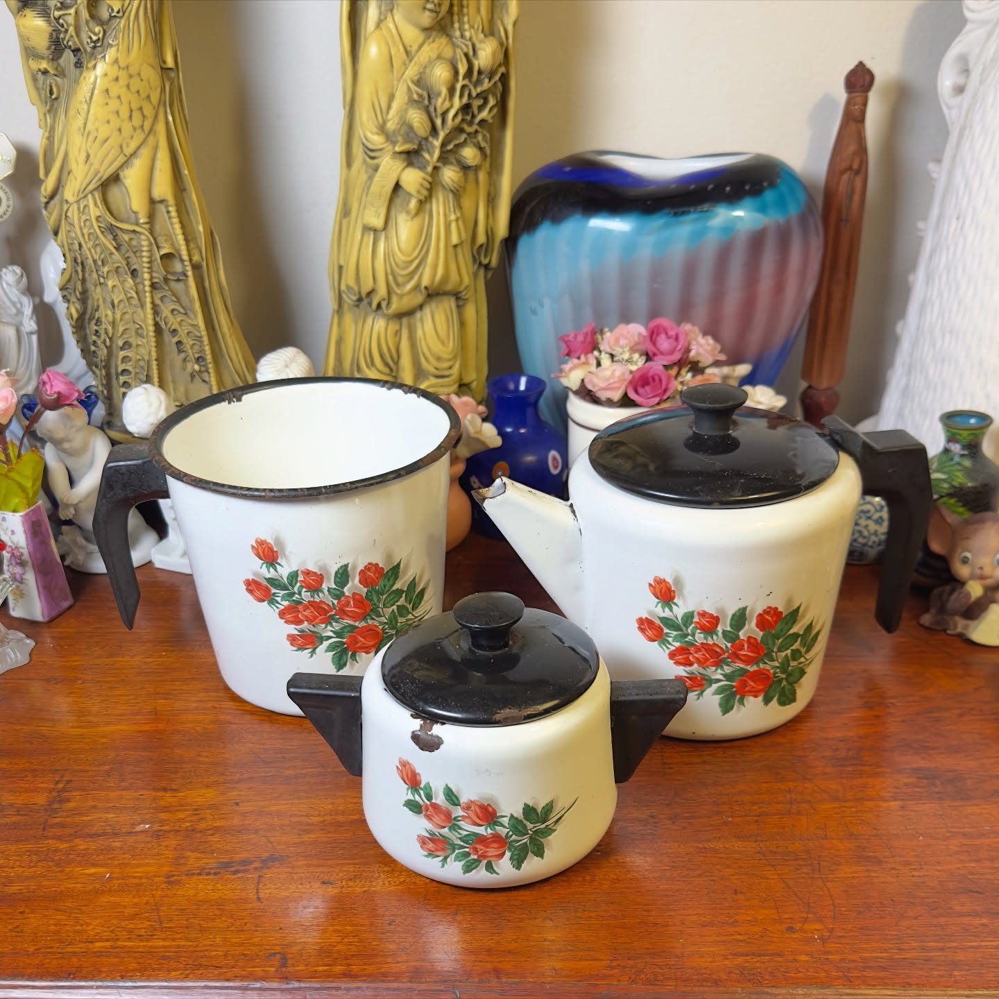 Um clássico com decoração de rosas vibrantes sobre branco. Apresenta as marcas do tempo (desgaste no esmalte) que realçam seu charme vintage e provam sua história. Inclui bule, açucareiro e canecão.