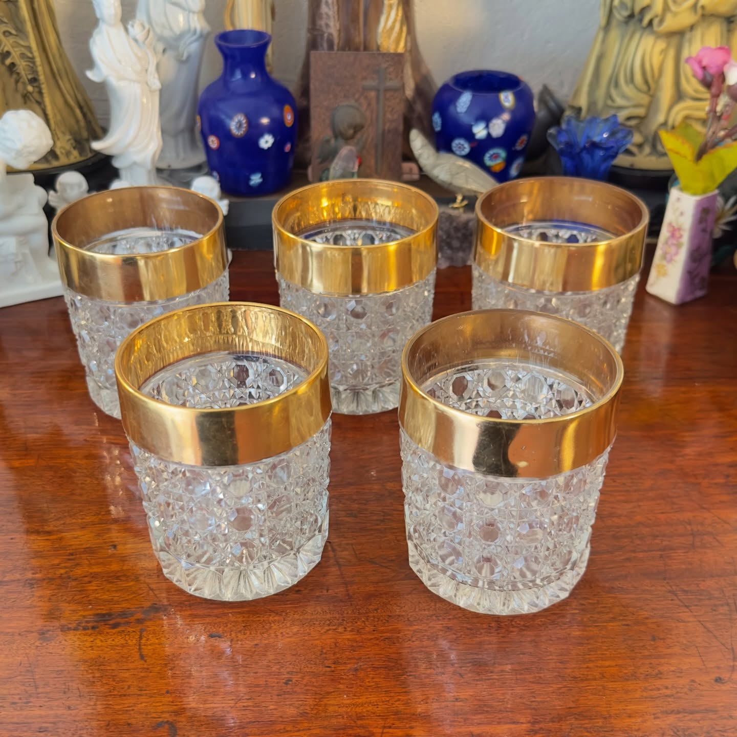 Conjunto de 5 copos em cristal lapidado, década de 70. Apresentam bocal com larga borda dourada e base com lapidação estrela.