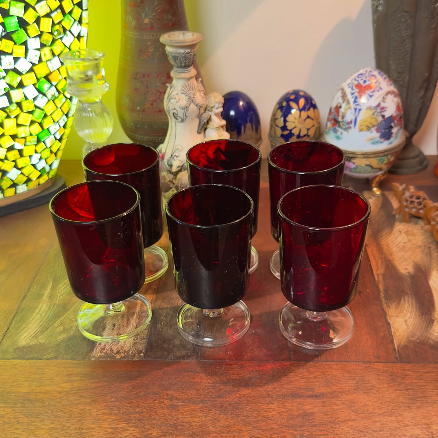 Conjunto de 6 cálices para licor em vidro rubi, décadas de 70/80. Peças em excelente estado de conservação, sem bicados ou trincas. Design clássico e elegante para servir.