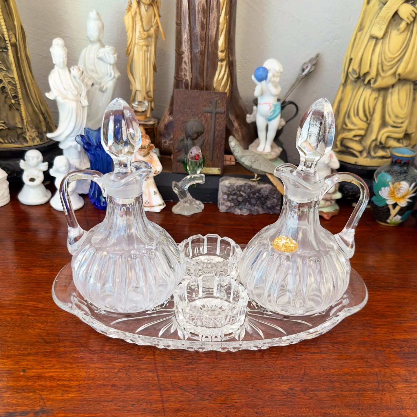 Elegante galheteiro com dois azeiteiros/vinagreiros , com tampa e alça. Acompanha duas pequenas saleiras/pimenteiros e uma bandeja oval decorada. Peças caneladas, ideal para servir azeite e vinagre à mesa com charme clássico. Ótimo estado de conservação.