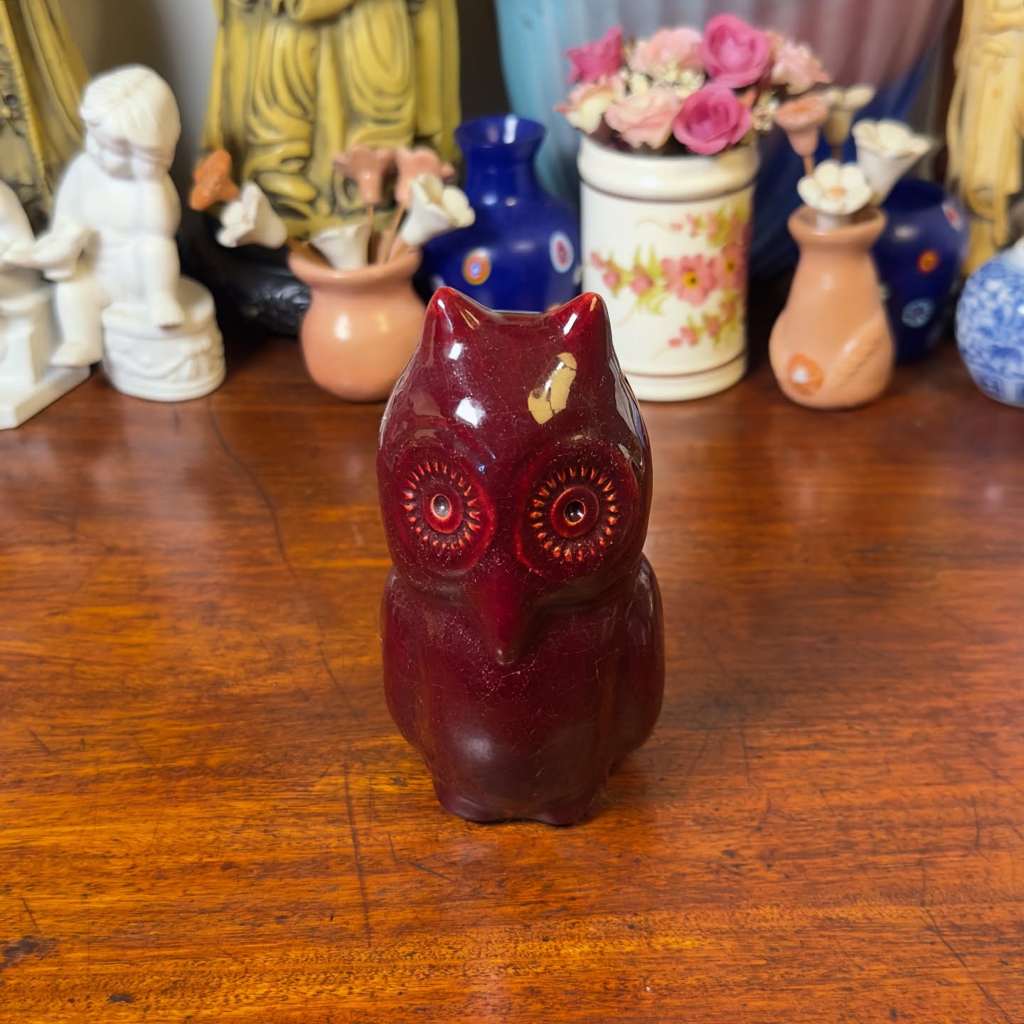Coruja em cerâmica com esmalte vinho de alto brilho e efeito craquelê, evidenciando a idade da peça.