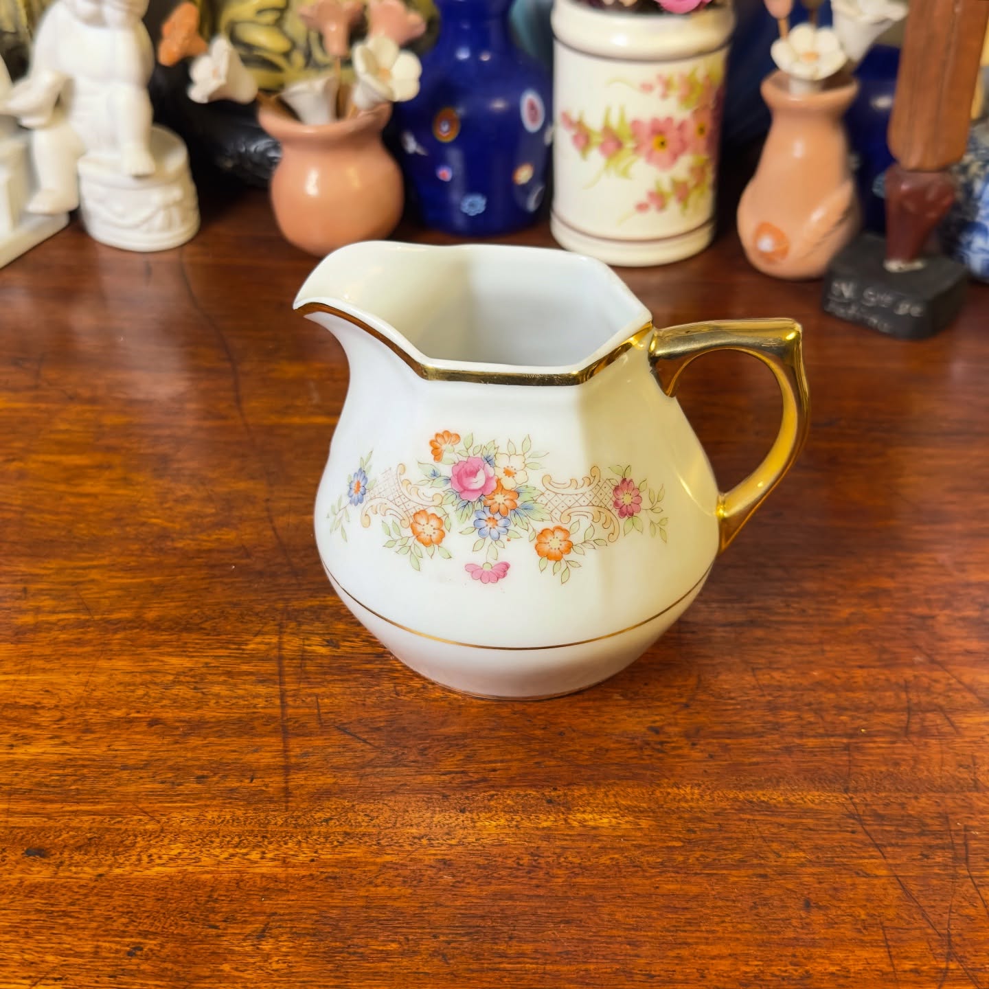 Delicada cremeira em porcelana Monte Alegre, datada entre 1950 e 1970. Apresenta o clássico formato elegante com decoração floral vibrante e acabamentos em filete de ouro. Peça essencial para completar um serviço de café ou chá com charme vintage.