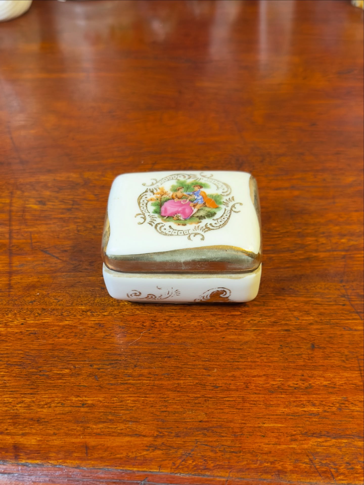 Delicada caixinha em antiga porcelana, decoração cena galante.