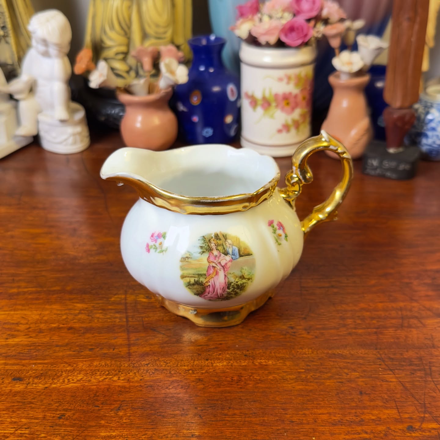 Delicada cremeira Real. Destaque para a clássica “cena galante”, emoldurada por detalhes dourados e graciosos arranjos florais.