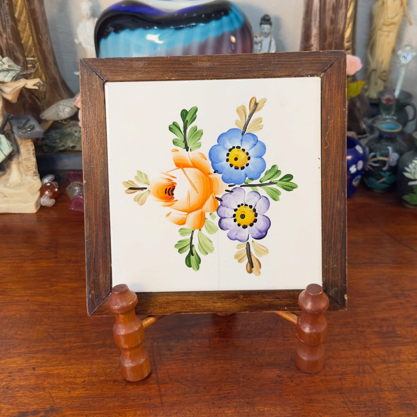 Peça utilitária em azulejo com pintura floral centralizada nas cores azul, violeta e laranja.