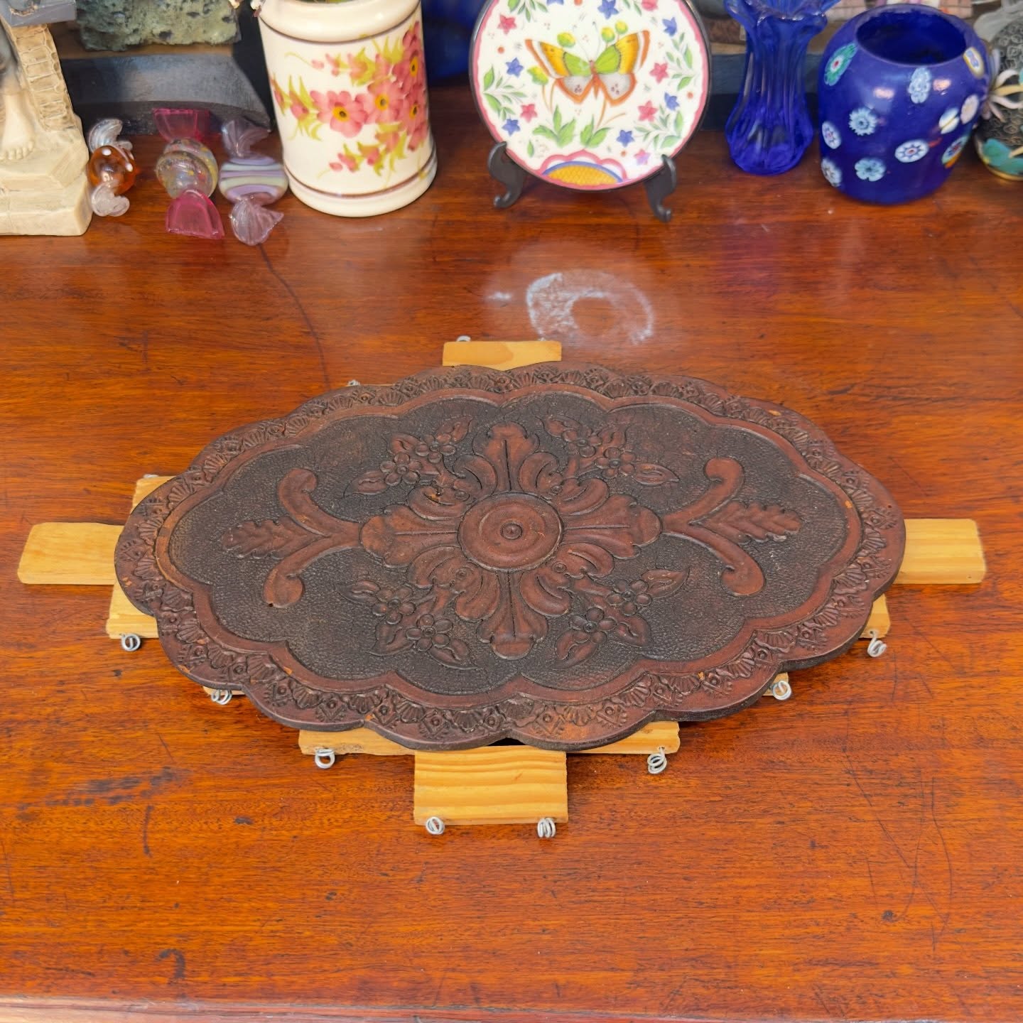 Conjunto funcional composto por base articulada de madeira clara e placa decorativa em couro prensado. A peça superior apresenta relevos florais detalhados e bordas recortadas, conferindo um toque rústico e sofisticado à mesa.