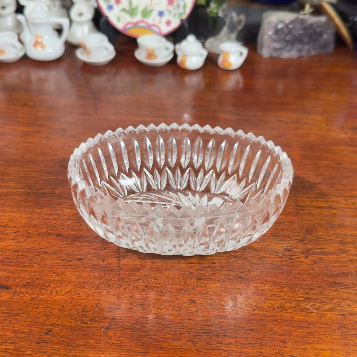 Despojador em cristal com lapidação geométrica e fundo em estrela. O formato oval possui bordas trabalhadas que refletem a luz. Peça para organizar acessórios ou decorar.