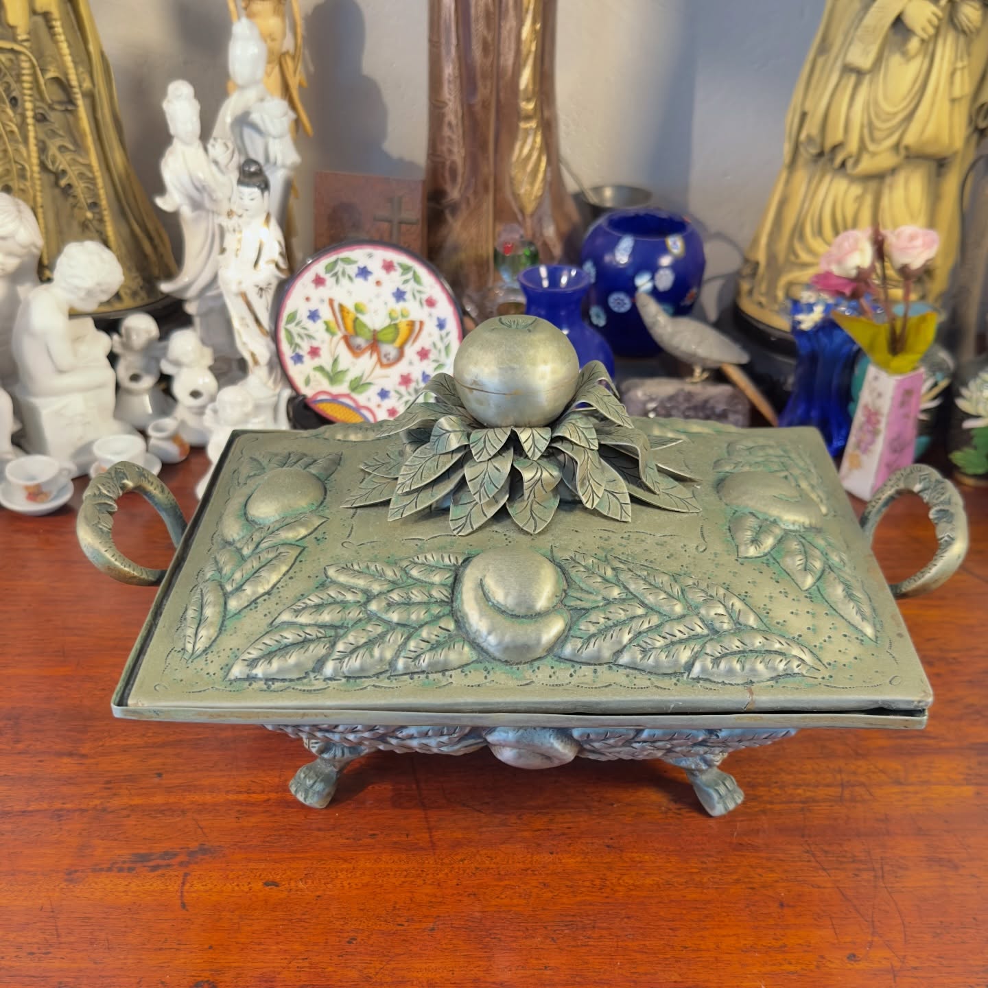 A tampa é coroada por um pegador em formato de fruto central sobre folhas sobrepostas. Laterais com alças trabalhadas e base sustentada por quatro pés de garra.