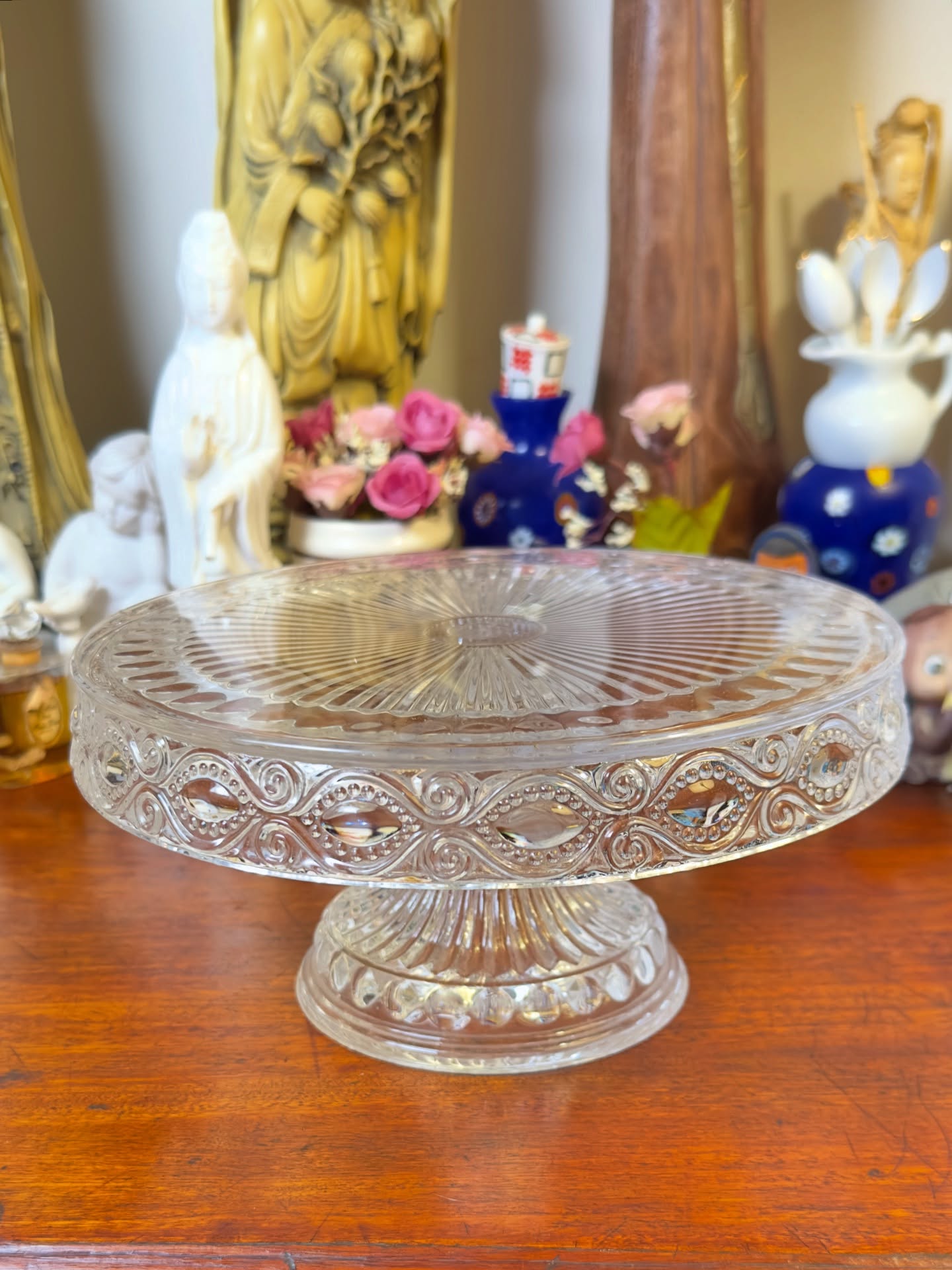 Elegante e delicada doceira em vidro finamente trabalhado, com pé alto e detalhes ricamente decorados.