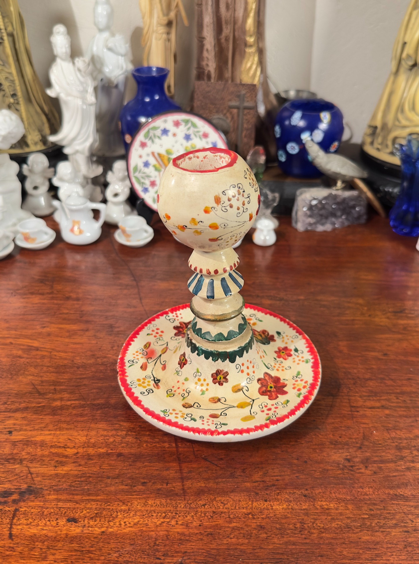 Encantador castiçal em madeira. Pintado inteiramente à mão, apresenta uma explosão de flores delicadas e padrões geométricos vibrantes em tons de vermelho, azul e dourado. Uma peça artesanal cheia de personalidade, perfeita para iluminar momentos especiais e decorar com muito charme e autenticidade.