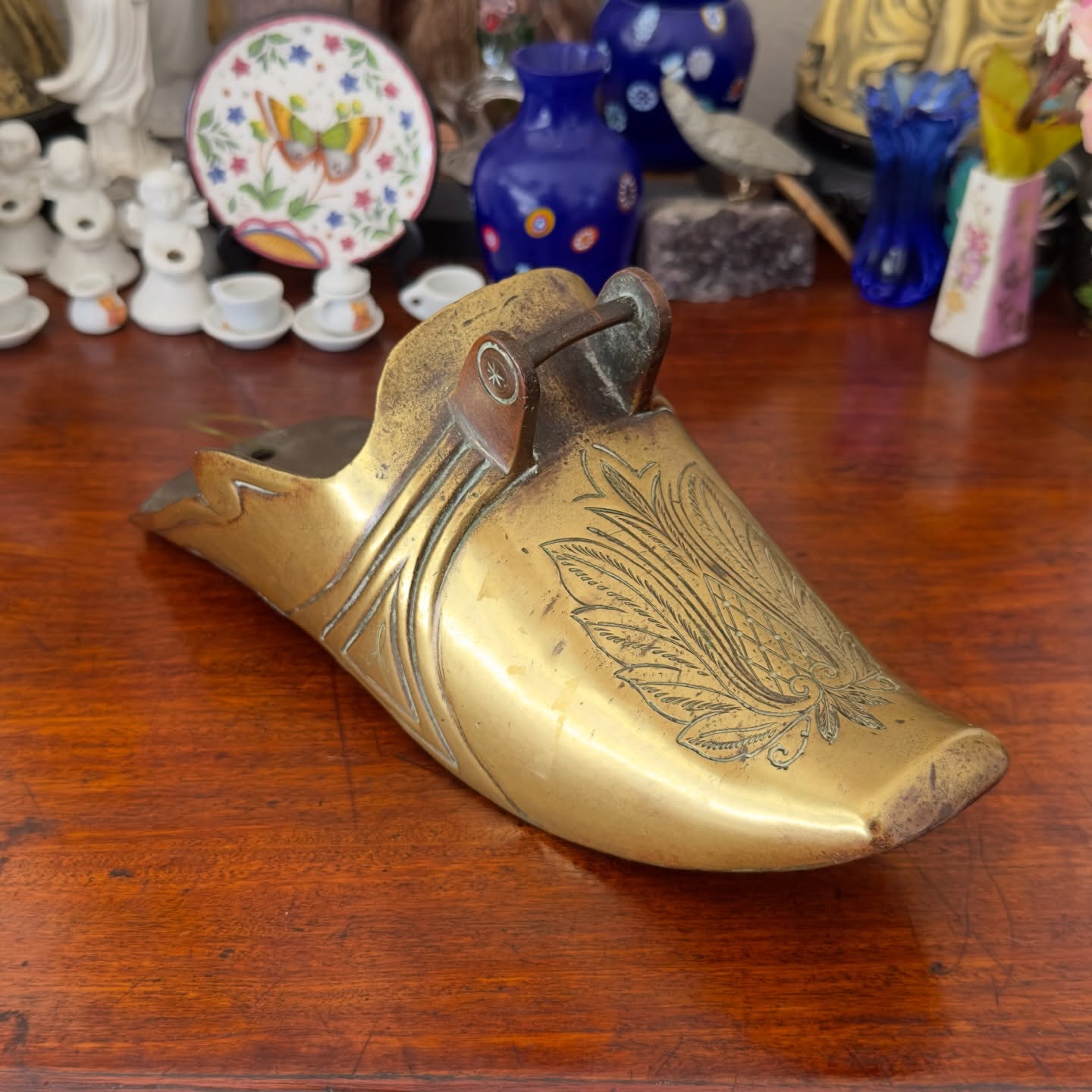 Peça em latão fundido com rica ornamentação gravada. O formato fechado permite o uso criativo como cachepot de parede, garantindo um toque rústico e sofisticado à decoração.