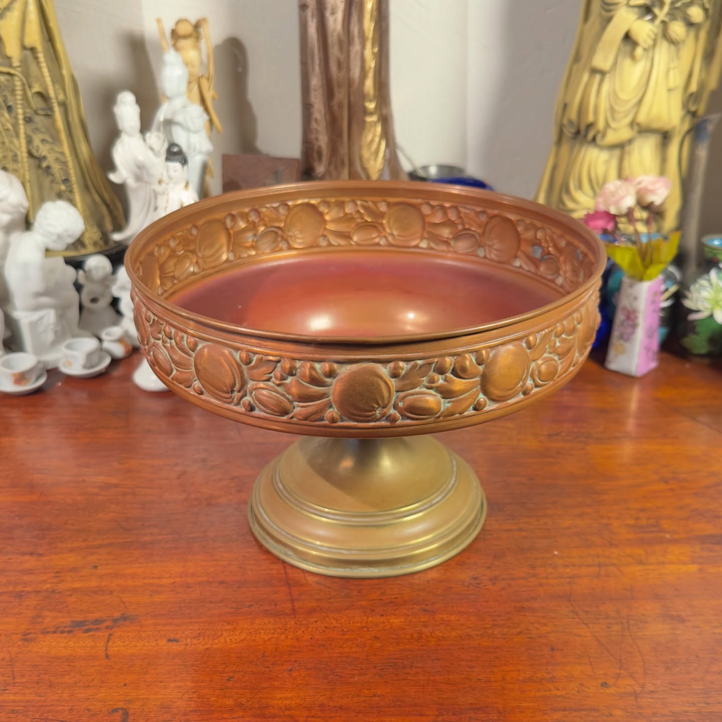 Apresenta corpo circular adornado por rico trabalho em relevo, exibindo motivos de frutas e folhagens detalhadas. A base elevada possui design clássico com anéis concêntricos, garantindo estabilidade e elegância. Peça imponente para compor mesas de jantar ou aparadores, servindo como objeto decorativo ou funcional.